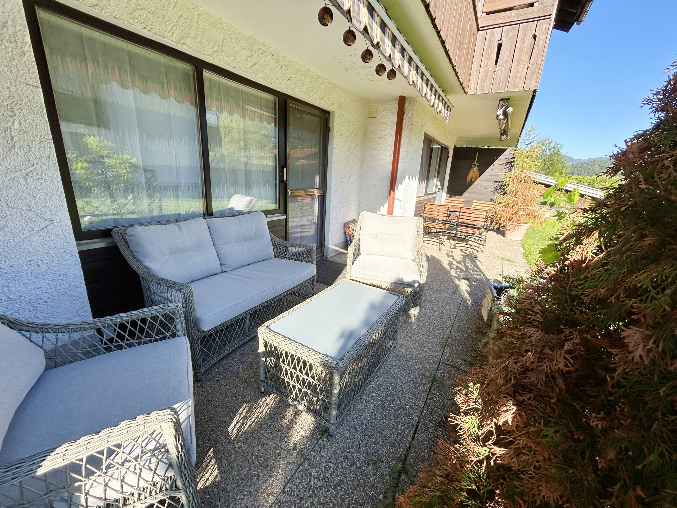 Die große Sonnenterrasse verfügt über einen separaten Frühstückstisch und einem bequemen Loungebereich sowie 2 Sonnenmarkisen. Auf der Terrasse können Sie von den ersten Sonnenstrahlen des Tages bis in den späten Abend die Sonne genießen und relaxen.