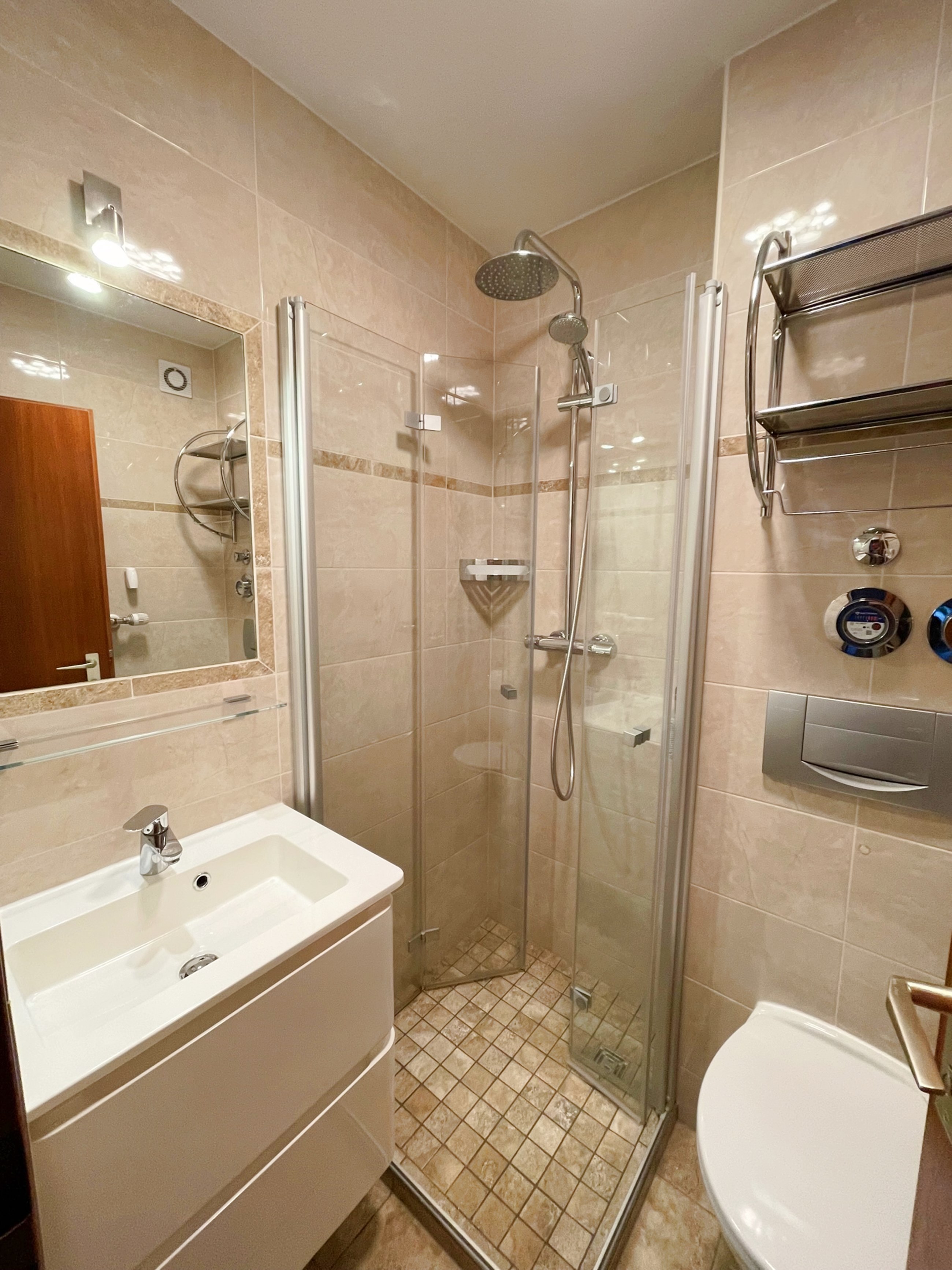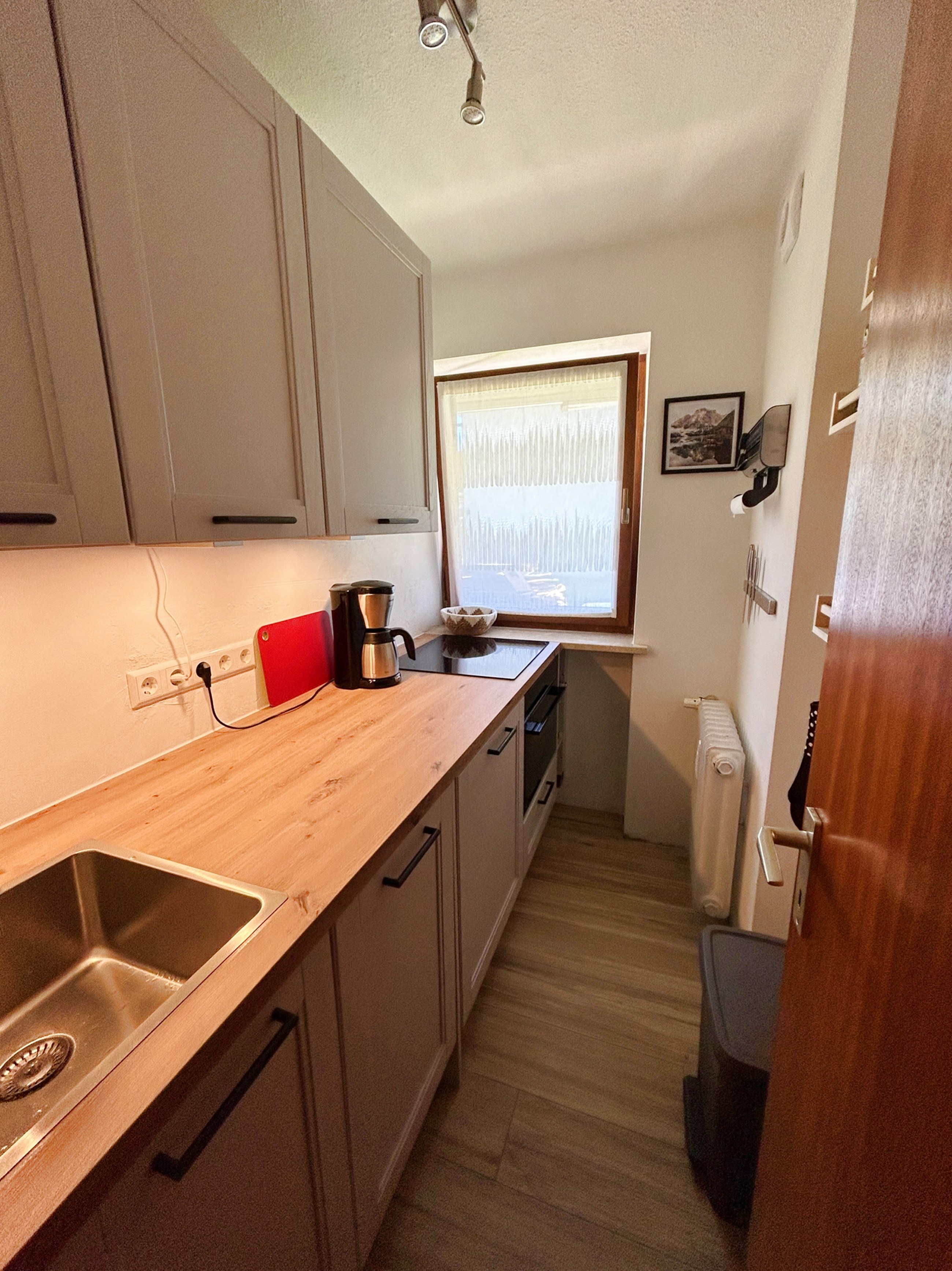 Das Bad ist mit einer ebenerdigen Dusche ausgestattet. Die Küche ist klein aber fein und mit Geräten auf dem neuesten technischen Stand ausgestattet, sodass Ihren Kochkünsten nichts im Wege stehen sollte.