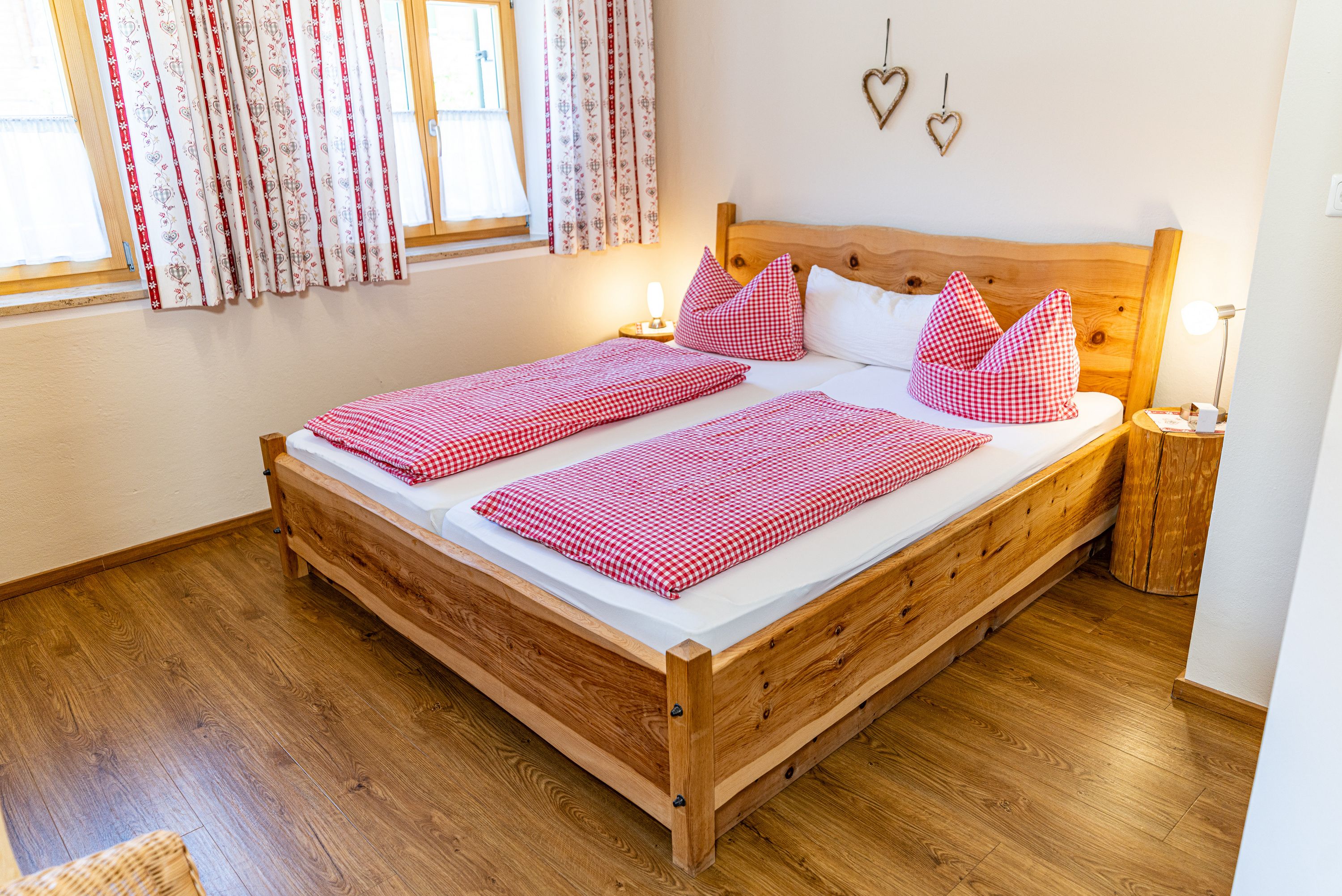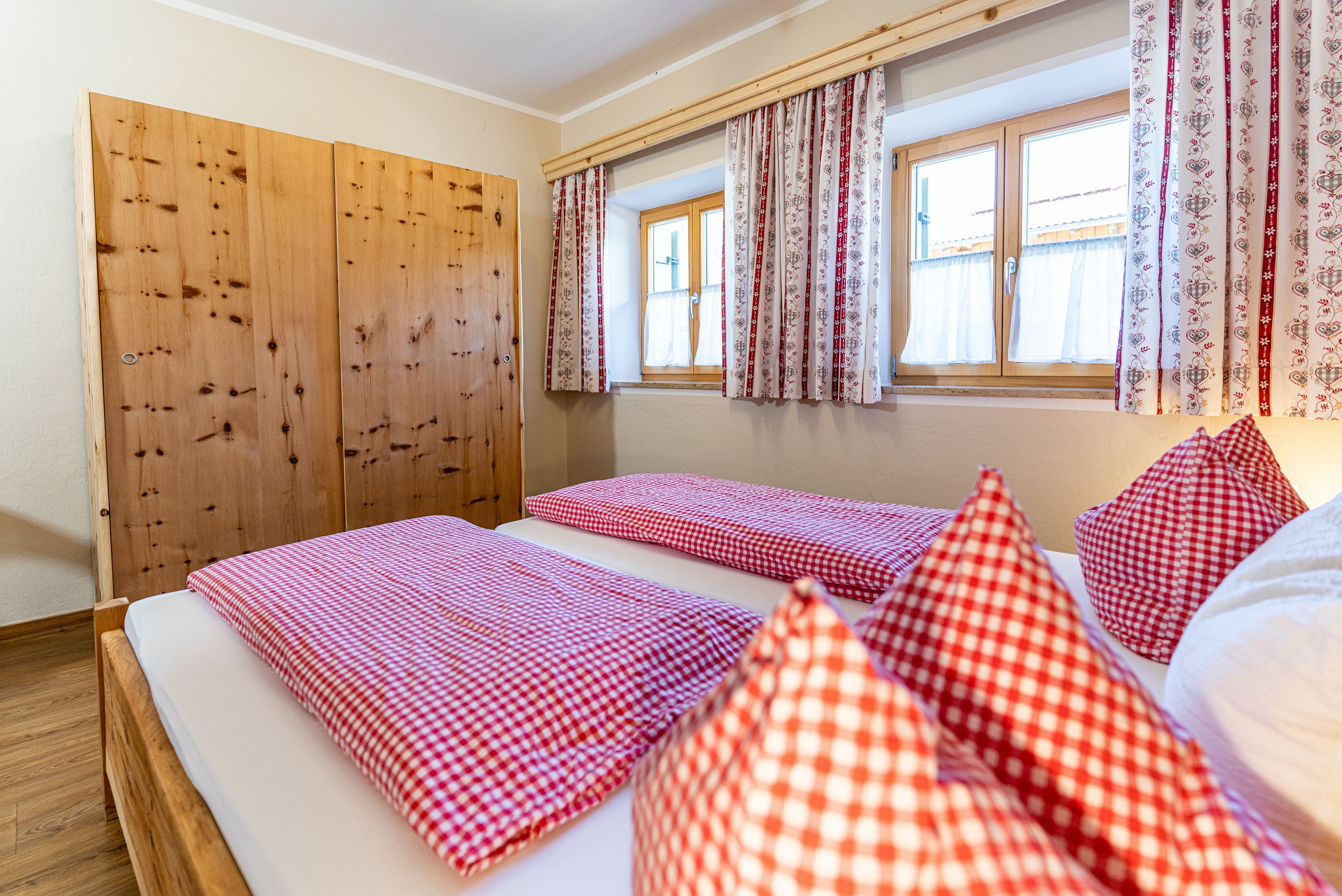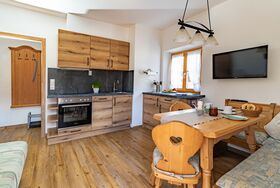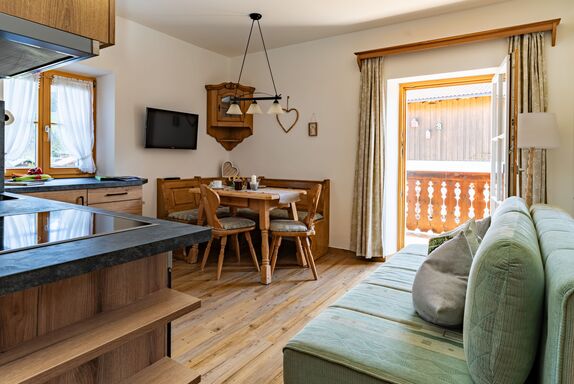 Mit Morgensonne und Zirbenholzgeruch – so erwachen Sie in unserer harmonisch eingerichteten Ferienwohnung für Paare oder Familien mit 1-2 Kindern. Die Ferienwohnung befindet sich im Erdgeschoss und über den Ostbalkon gelangt man direkt in unseren großen Garten zu den Hoftieren und zum Spielplatz für die Kinder.