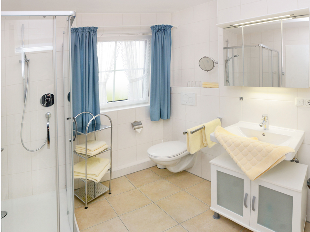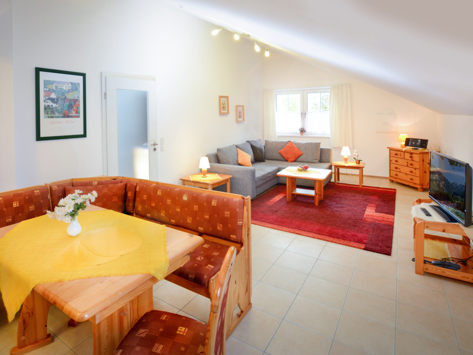 Die großzügige, helle Ferienwohnung Rauschberg mit separatem Schlafzimmer befindet sich in der 1.Etage und verfügt über einen komplett ausgestatteten Küchenbereich (Mikrowelle, 4-Platten Ceranfeld, Dunstabzug ...) mit Sitzecke. Die Wohnung ist für Allergiker geeignet, da sie nur mit Fliesen- und Vinylböden ausgestattet ist. Haustiere sind deshalb bei uns nicht möglich. Der große, 2 Meter breite überdachte Südbalkon hat einen herrlichen Bergblick und ist von anderen Gästen nicht einsehbar. Ein Zimmersafe, kostenloses WLAN und ein Laptop gehören ebenfalls zur Ausstattung. Das moderne Bad mit Fenster, Glasdusche und Spiegelschrank bietet genügend Abstellfläche.