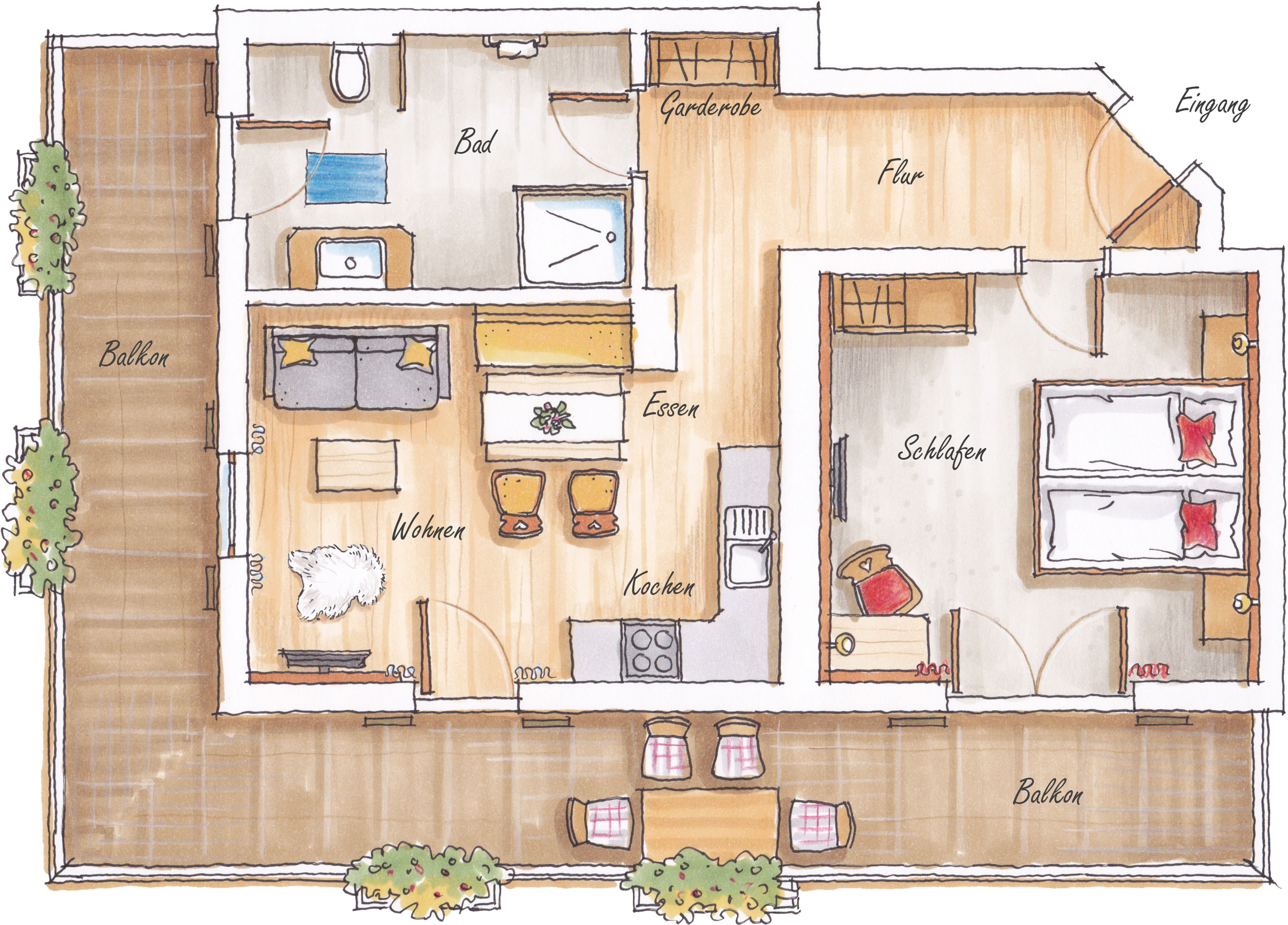Fühlen Sie sich wie zu Hause in unserer neuen, gemütlichen Ferienwohnung. Diese hat ca. 65 qm. Uns liegt es am Herzen, hauptsächlich Naturmaterialien wie Altholz von eigener Alm, Naturholzböden, Leinen und Filz zu verwenden. Im Wohnzimmer befindet sich ein Flat Screen TV, Stereoanlage, DVD-Player, große Schlafcouch für 2 Personen und ein Zugang zum eigenen Balkon.