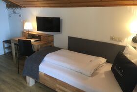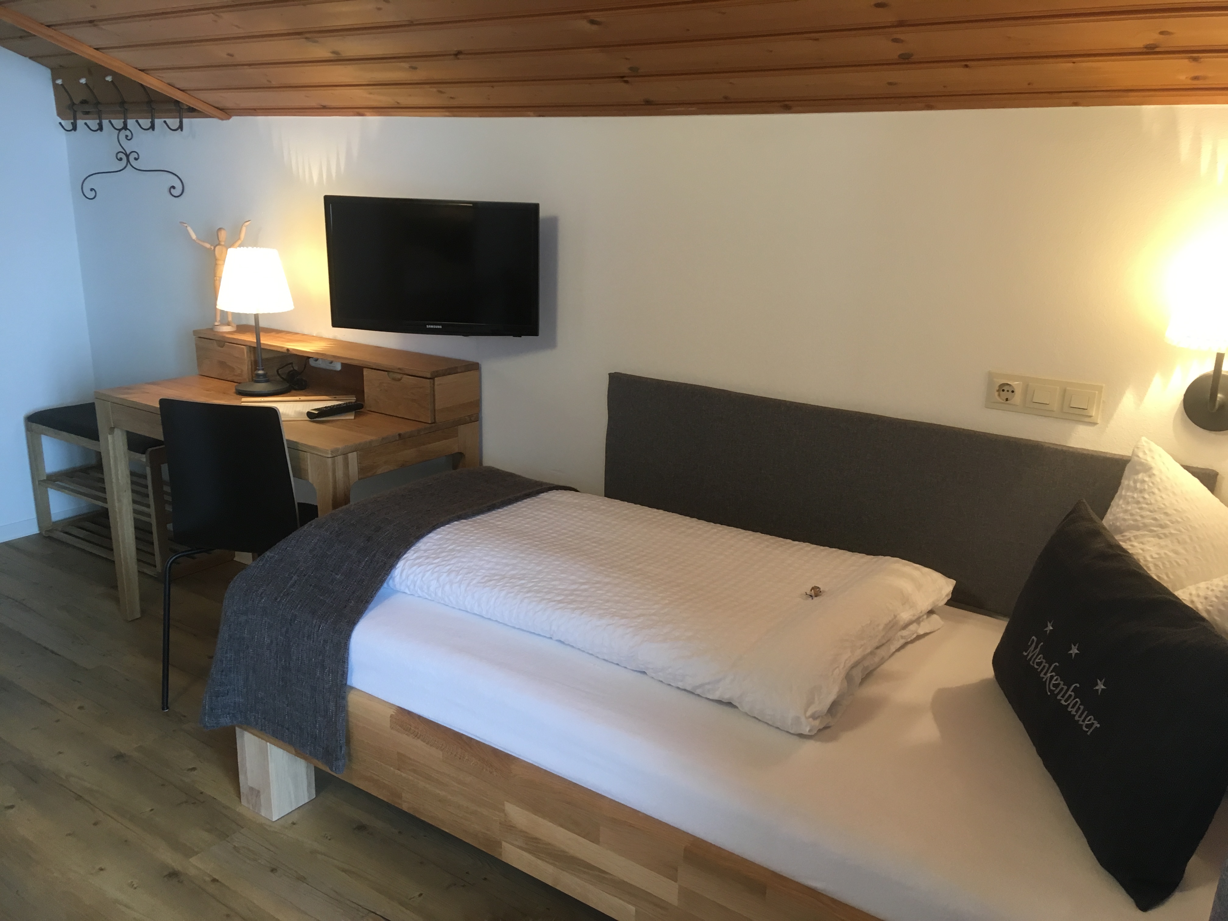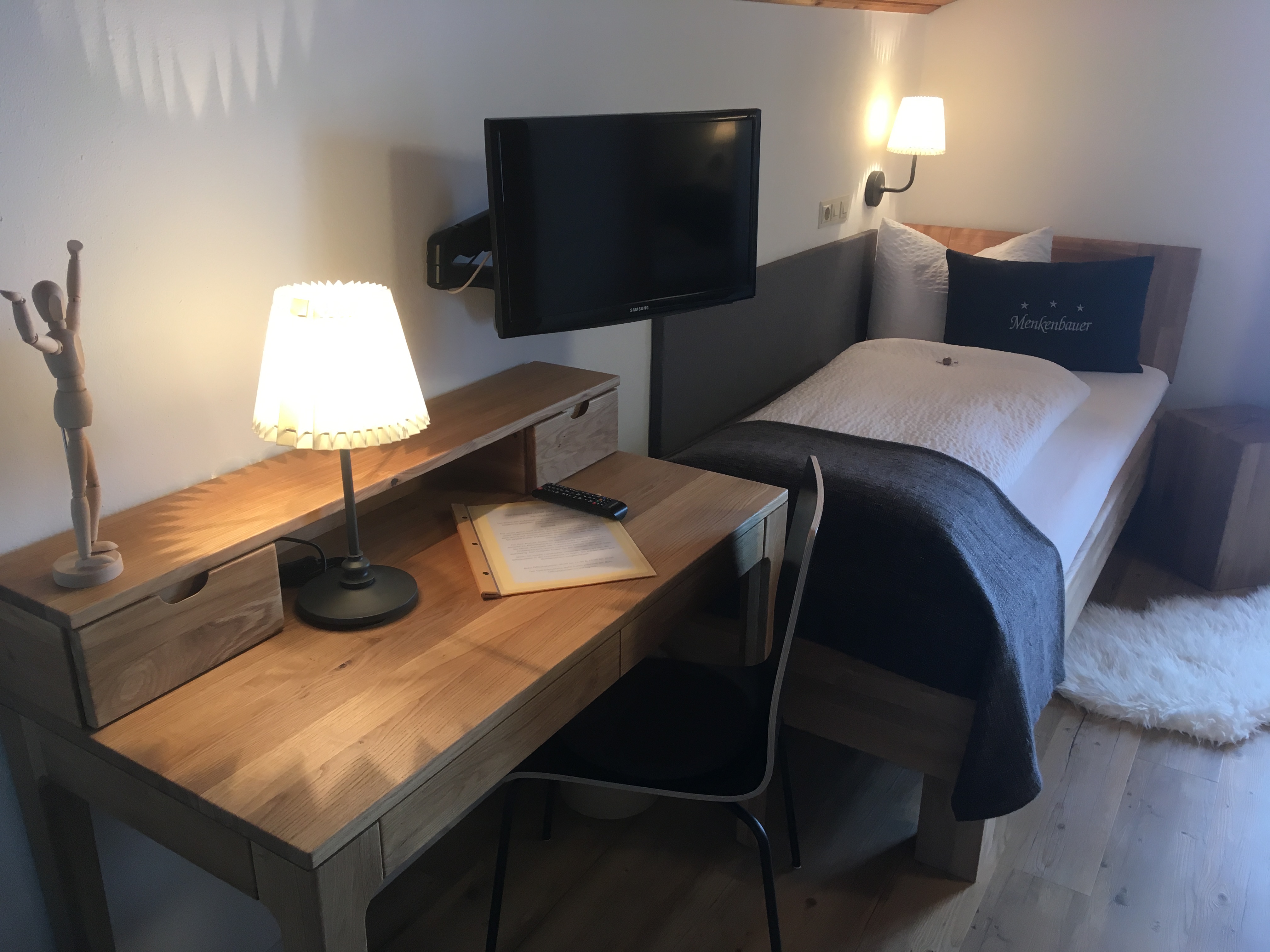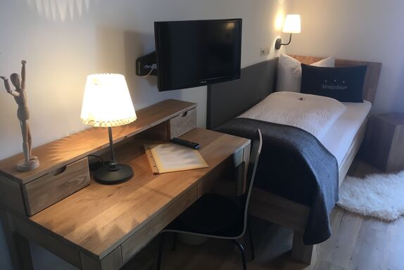 In unserem charmanten, neu renovierten König Ludwig Einzelzimmer ( ca. 13 qm )in der zweiten Etage.Harmonisch gestaltet im modernen Landhaus Stil, Allergiker geeignet ( kein Teppichboden, Synthetik Decke/ Kissen, Matratzen Encasing ) Sehr ruhig gelegen, mit Schreibtisch, Flat- TV, W-Lan und Radiowecker.Das moderne, kleine Bad und der geschützte Balkon mit Bergblick runden den perfekten Urlaub ab.
