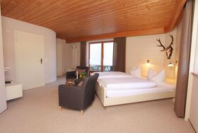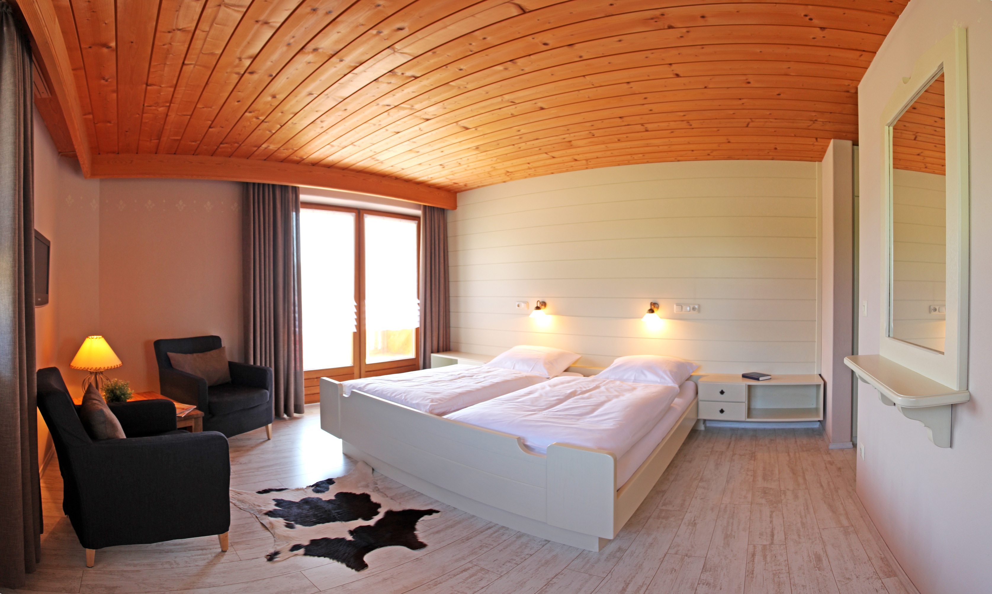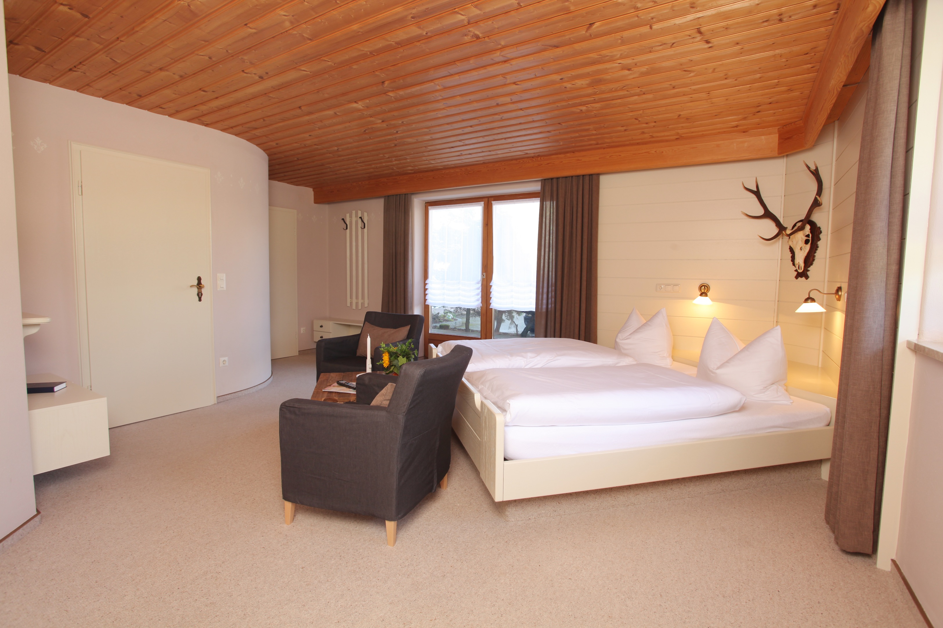 in unseren schönen, hellen König Ludwig Doppelzimmern im Erdgeschoß/Hochparterre.Liebevoll renoviert im modernen Landhaus Stil, Allergiker geeignet, ruhig gelegen, mit gemütlicher Sitzecke, Fussbodenheizung, Flat- TV und Radiowecker.Die stilvollen Bäder und der schöne Balkon, umgeben von Wiesen und Wäldern, mit traumhaften freien Bergblick, runden den perfekten Urlaub ab.Zimmer 23 ( auch als Dreibettzimmer buchbar) mit Terrasse.