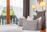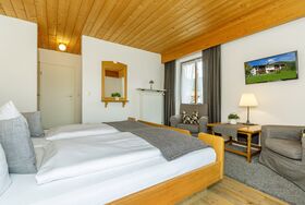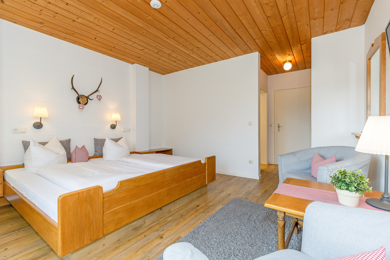 in unseren neu renovierten König Ludwig Doppelzimmern in der ersten Etage.Harmonisch gestaltet im modernen Landhaus Stil, Allergiker geeignet ( kein Teppichboden, Synthetik Decken/ Kissen, Matratzen Encasings ) Sehr ruhig gelegen, mit gemütlicher Sitzecke, Flat- TV, W-Lan und Radiowecker.Die modernen Wellness Bäder und die großzügigen Balkone, umgeben von Wiesen und Wäldern, mit traumhaften freiem Bergblick, runden den perfekten Urlaub ab.