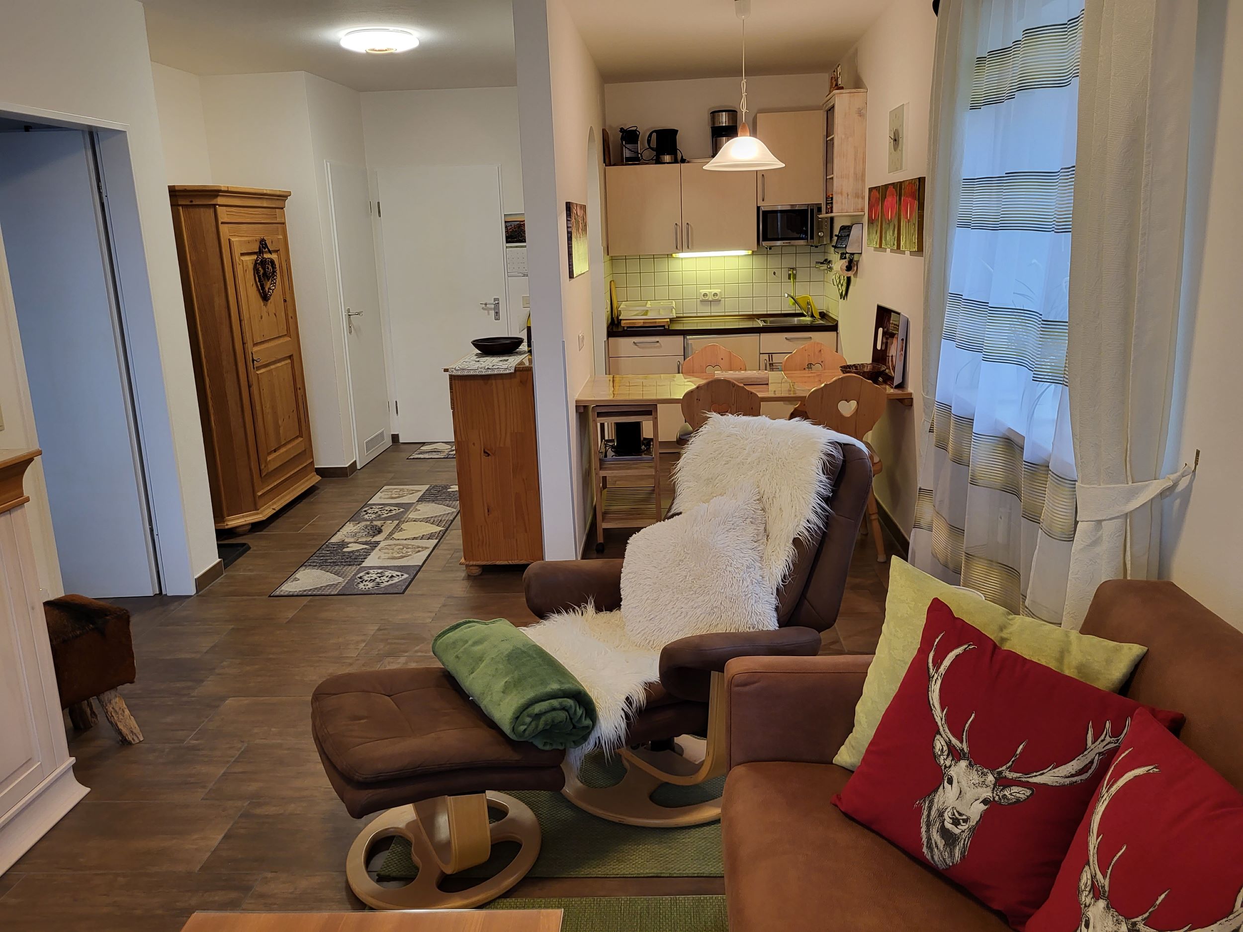 Ruhige, gepflegte Terrassenwohnung in herrlicher Einzellage direkt am Waldrand mit schönem Ausblick. Nur wenige Gehminuten ins Zentrum und zur Hocheckbahn. Idealer Ausgangspunkt für Wander- und Radtouren, Ski-Abfahrt und Langlauf. Die Wohnung wurde komplett renoviert. Neues Duschbad und WC separat. Überdachte Terrasse, ca. 13,5qm, mit Gartenmöbeln. Die Betten sind für Allergiker geeignet. Die Küche ist mit einem 2-Plattenherd und einer Mikrowelle ausgestattet sowie mit Küchenutensilien.