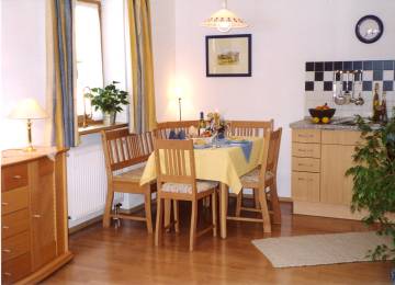 Die ca. 50 qm große Ferienwohnung bietet Platz für maximal 5 Personen. Die Wohnküche ist ausgestattet mit einem Kühlschrank, einer Mikrowelle und einem Backofen. Ein Balkon lädt im Sommer zum verweilen ein. Bettwäsche und Handtücher sind bereits vorhanden. W-LAN ist in der Ferienwohnung vorhanden. Insgesamt gibt es zwei Schlafzimmer. Im ersten Schlafzimmer befindet sich ein Doppelbett für 2 Personen und im anderen Schlafzimmer zwei Einzelbetten. Im Wohnzimmer ist noch ein Schlafsofa für eine Person vorhanden.