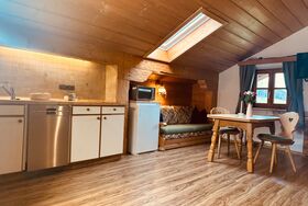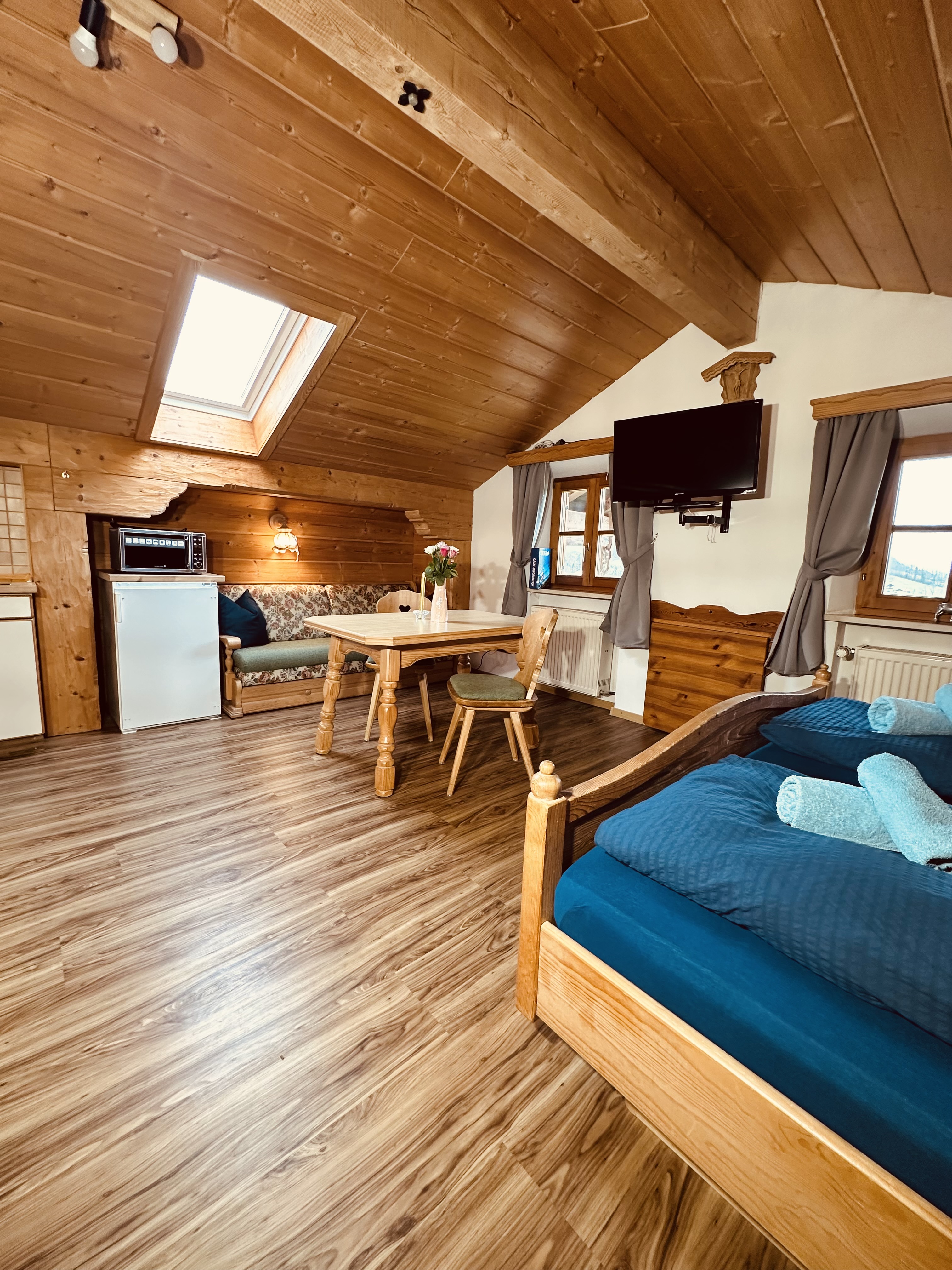 Diese gemütliche Ferienwohnung in der 2. Etage unter dem Dach bietet auf 33 m² alles, was Sie für einen erholsamen Aufenthalt benötigen. Der offene Wohn- und Schlafbereich ist ideal für Paare oder Alleinreisende und besticht durch eine angenehme Atmosphäre. Das komfortable Doppelbett (180x200) sorgt für erholsame Nächte, und der Essbereich mit zwei Stühlen lädt zu entspannten Mahlzeiten ein.