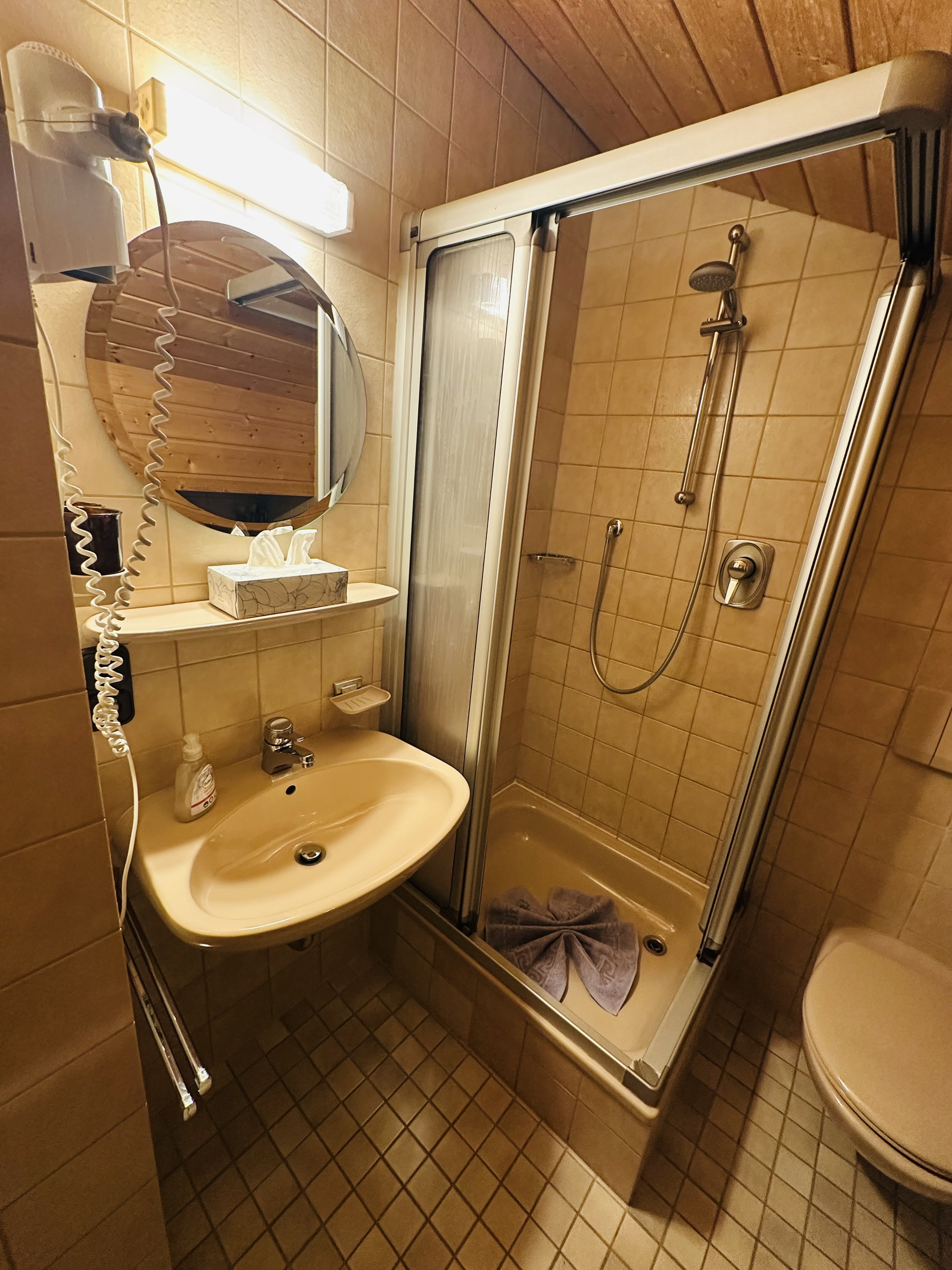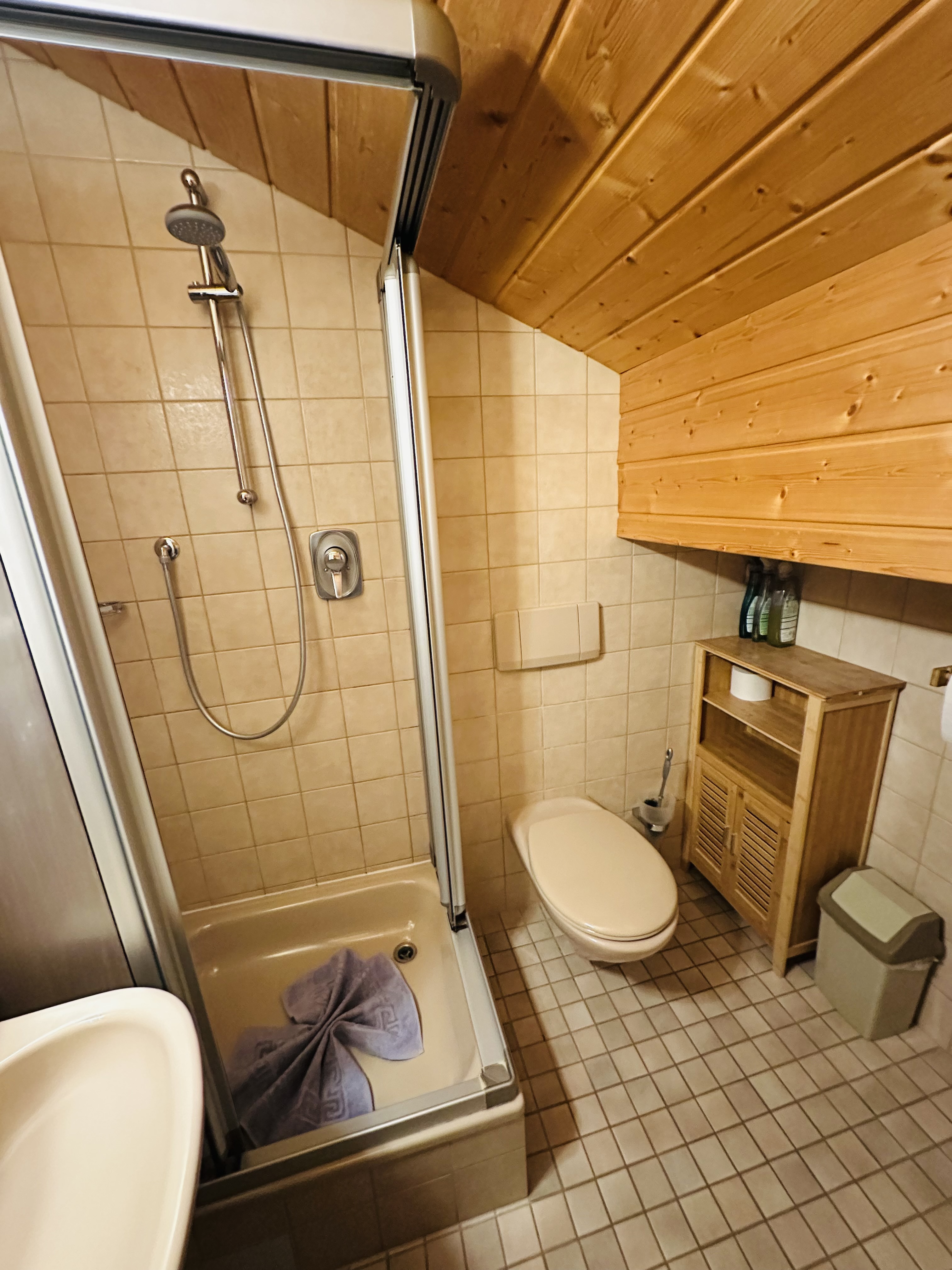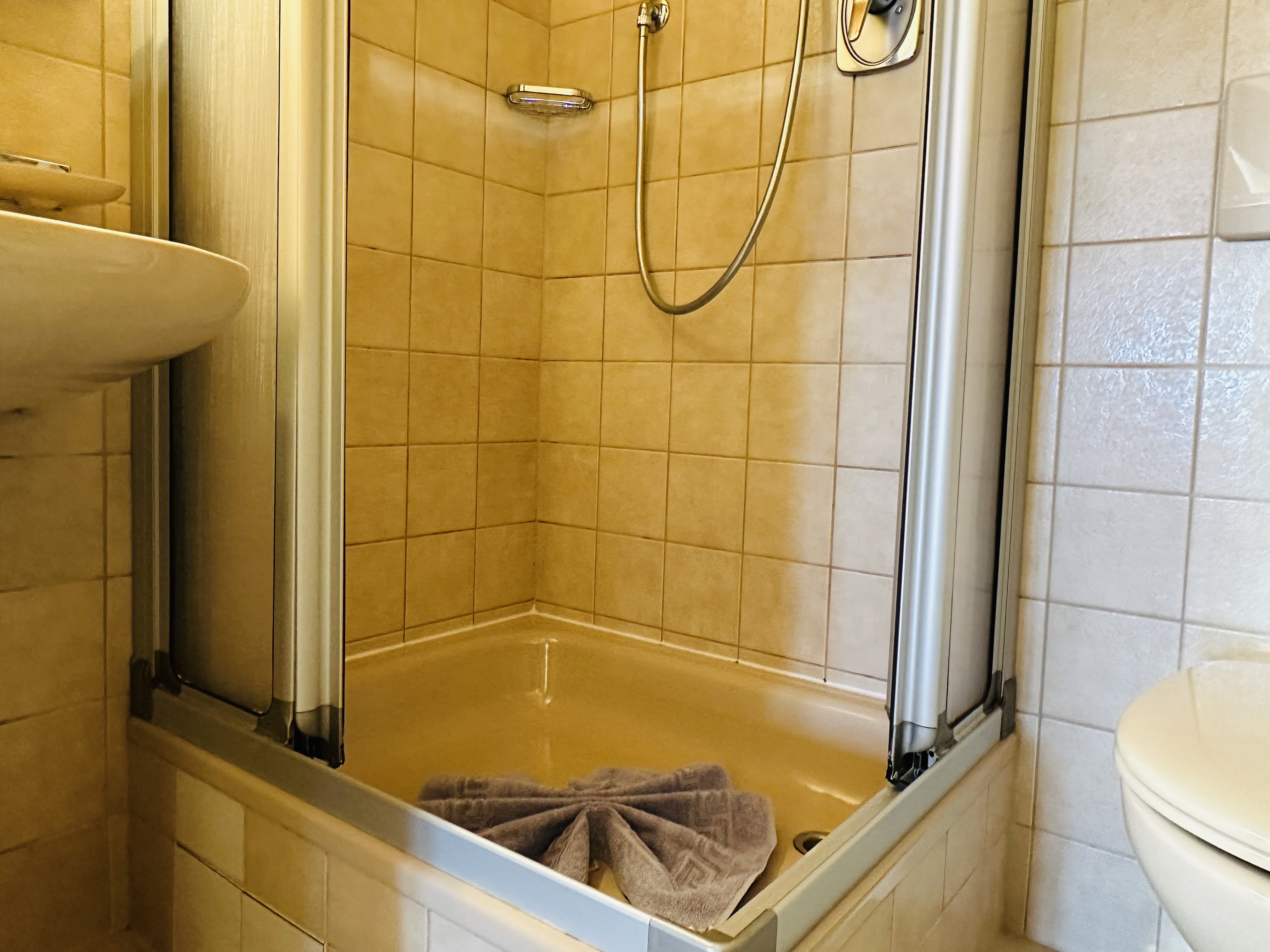 Das Badezimmer mit Dusche, WC und Waschbecken rundet das Angebot ab und sorgt für zusätzlichen Komfort.