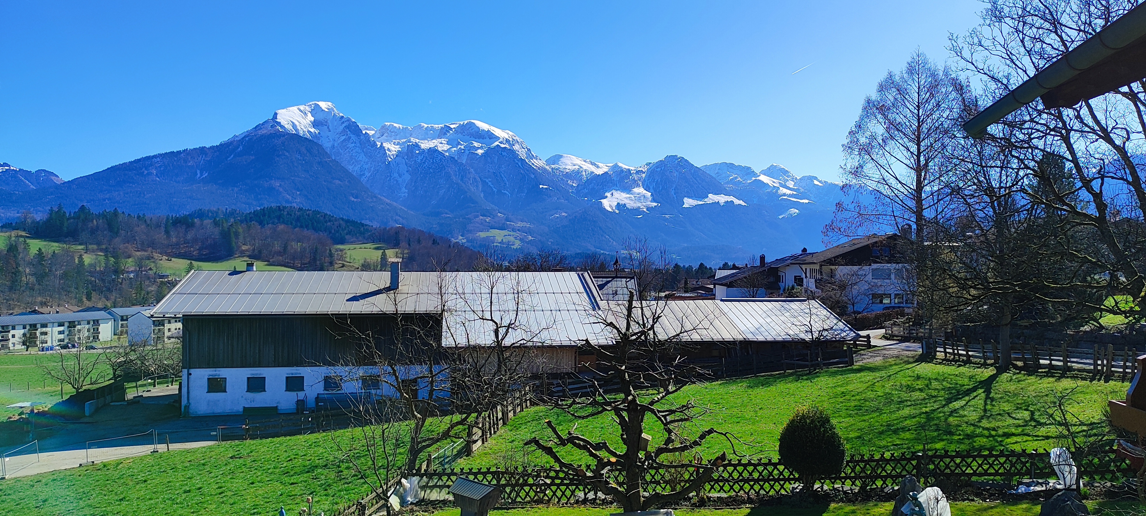 Genießen Sie den herrlichen Blick von Ihrer Ferienwohnung auf das Bergpanorama der Berchtesgadener Alpen.