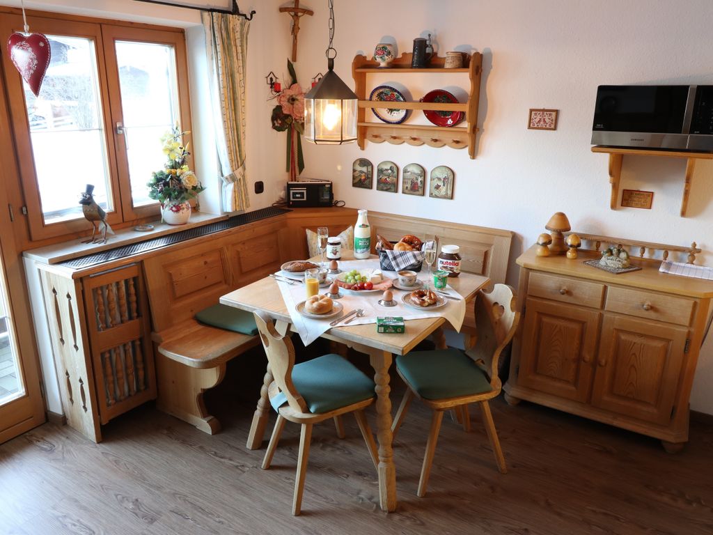 Am bayerischen Esstisch und auf der Eckbank können Sie sich dann Ihr Essen schmecken lassen.