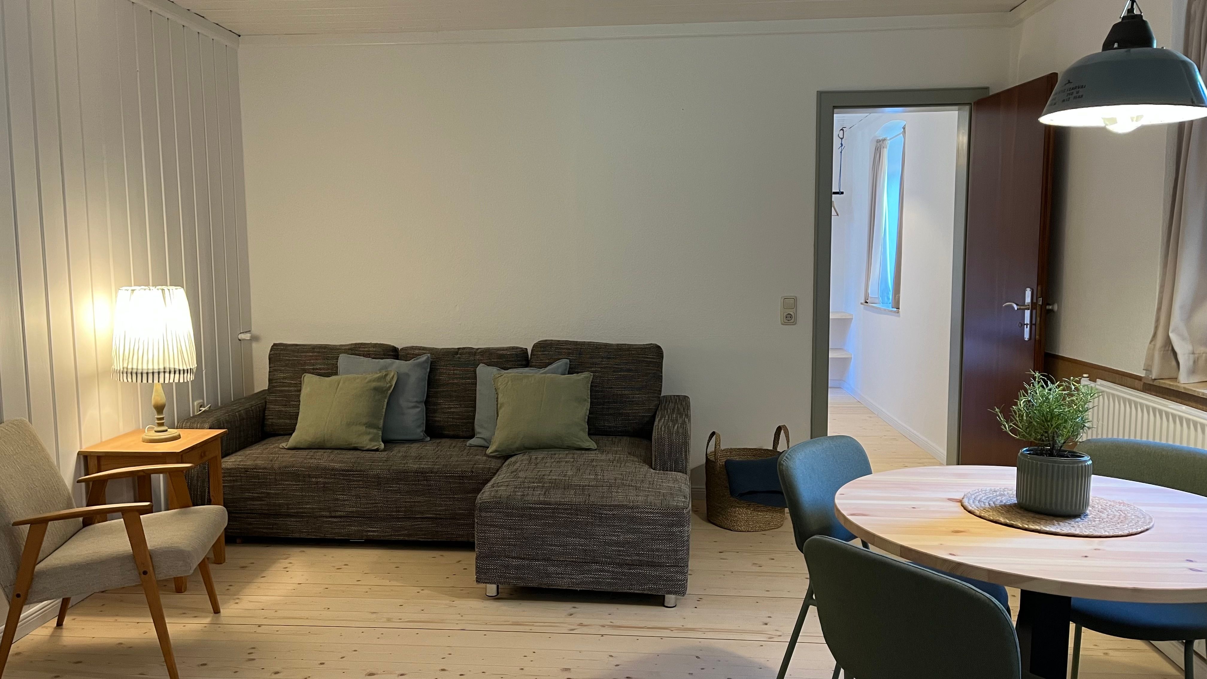 Im Schlafzimmer erwartet Sie ein komfortables Doppelbett (1,80 × 2,00 m), während das Wohnzimmer mit einer zusätzlichen Schlafgelegenheit Flexibilität bietet. Die voll ausgestattete Küche lädt dazu ein, gemeinsame Mahlzeiten zu genießen.
