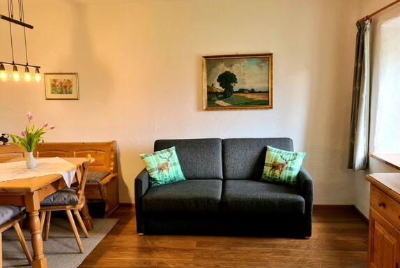 Unser ehemaliger Bauernhof mit gemütlichen Ferienwohnungen, ca. 3,5 km vom Ortszentrum entfernt, liegt an einem sonnigen Südhang mit sehr schönem Bergblick, ruhig und von Wiesen umgeben.