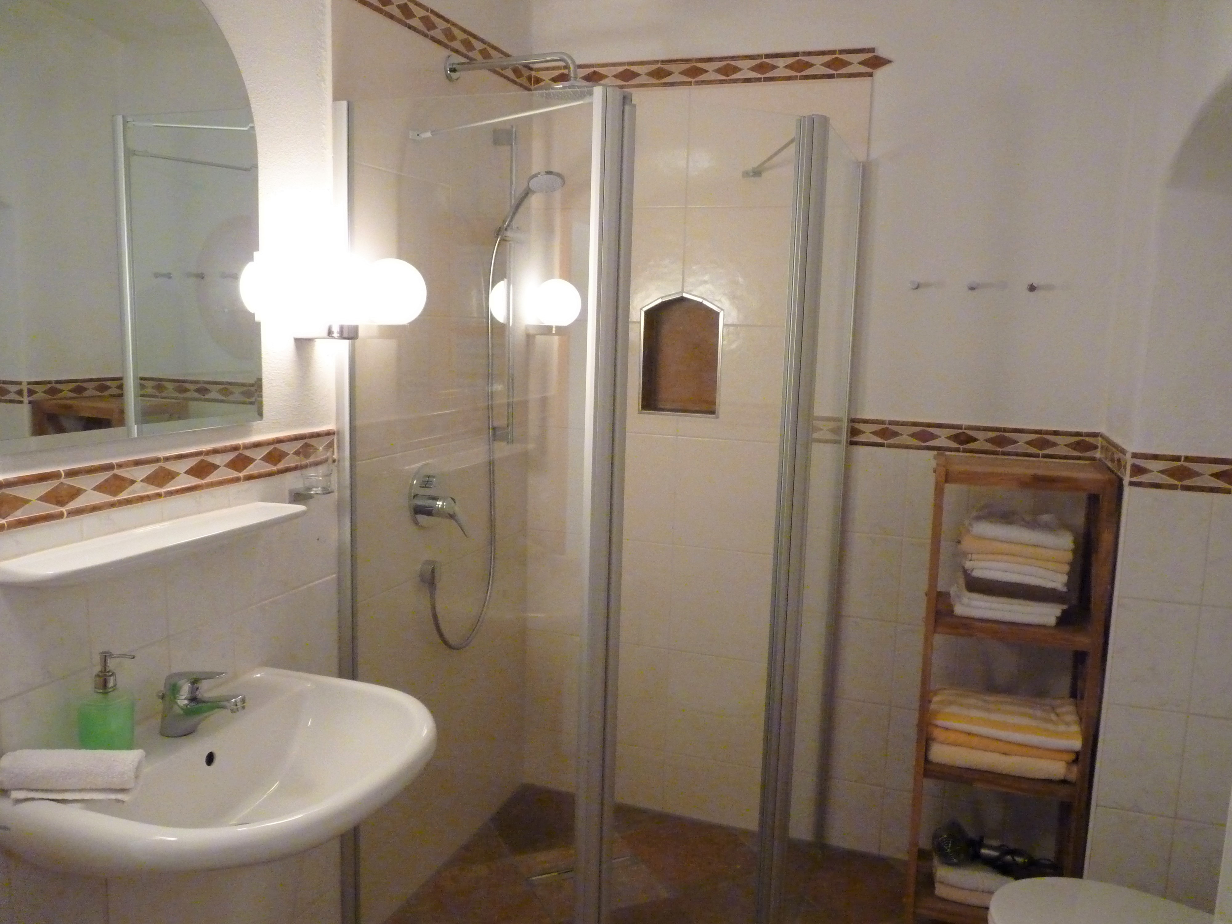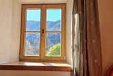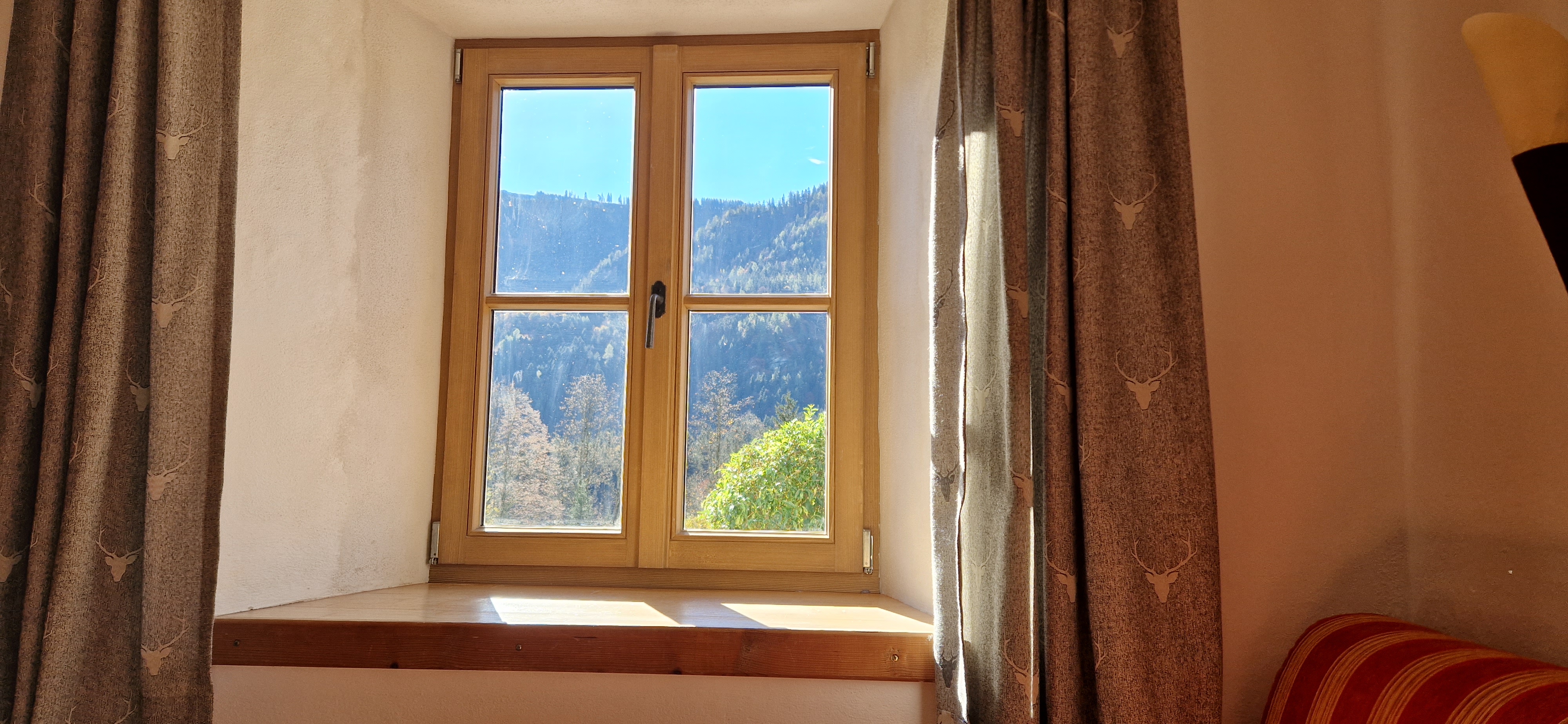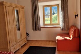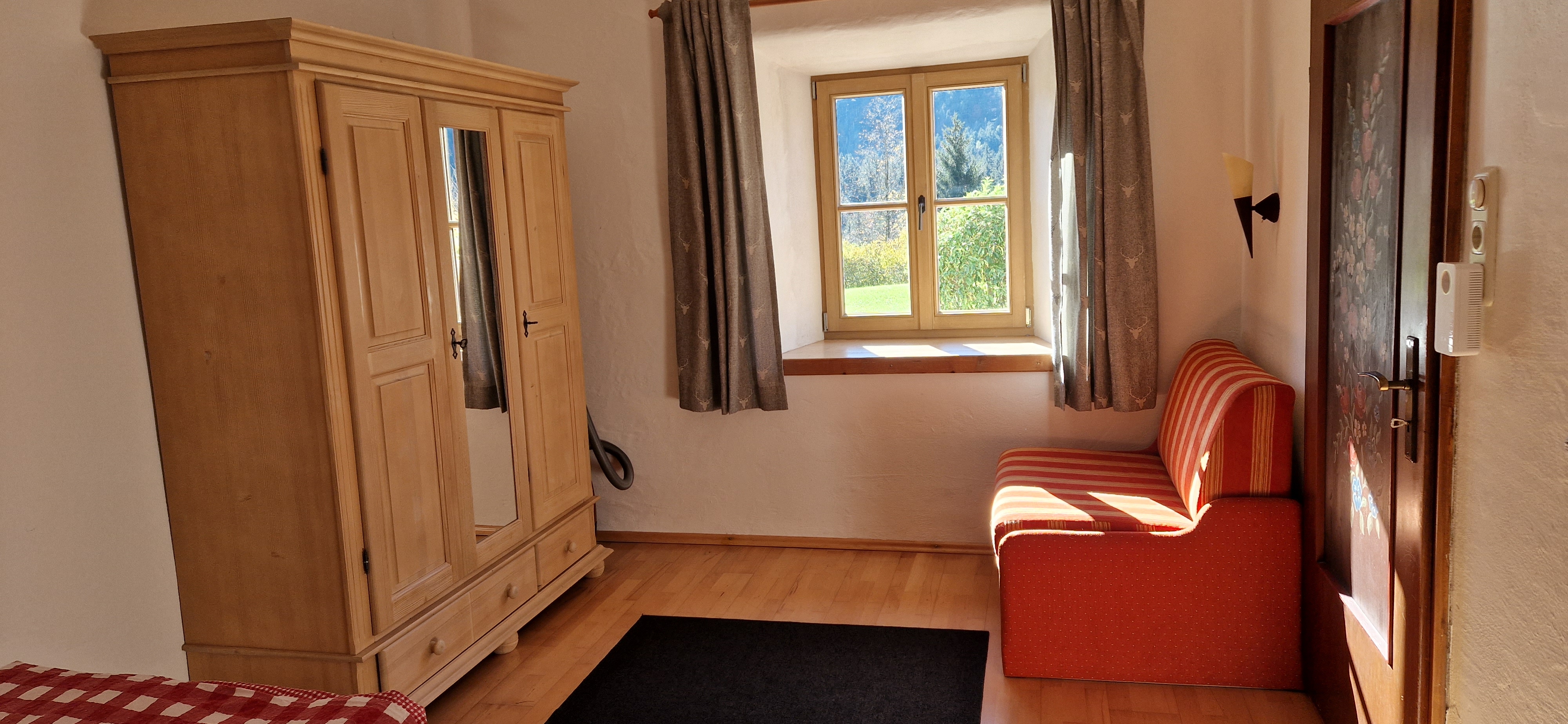 Wohnraum mit Einbauküche, Esstisch, Schlafsofa, ein Schlafzimmer mit Doppelbett, Bad (Dusche, WC, Waschbecken), Terrasse mit unverbautem Bergblick.Das Plus:Eigene Terrasse, geräumiges BadDie Lage: Im Haupthaus, separater Eingang Erdgeschoß