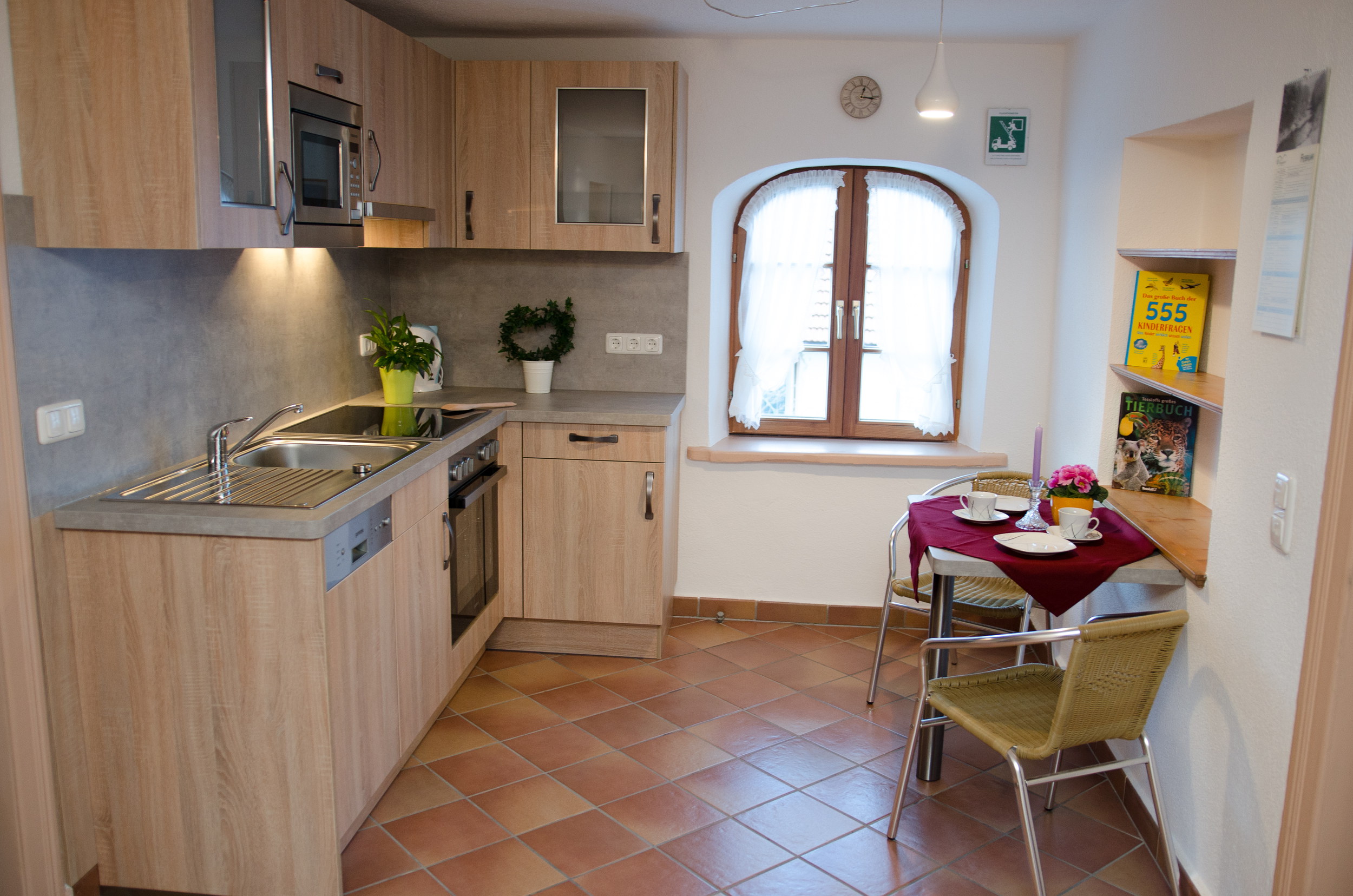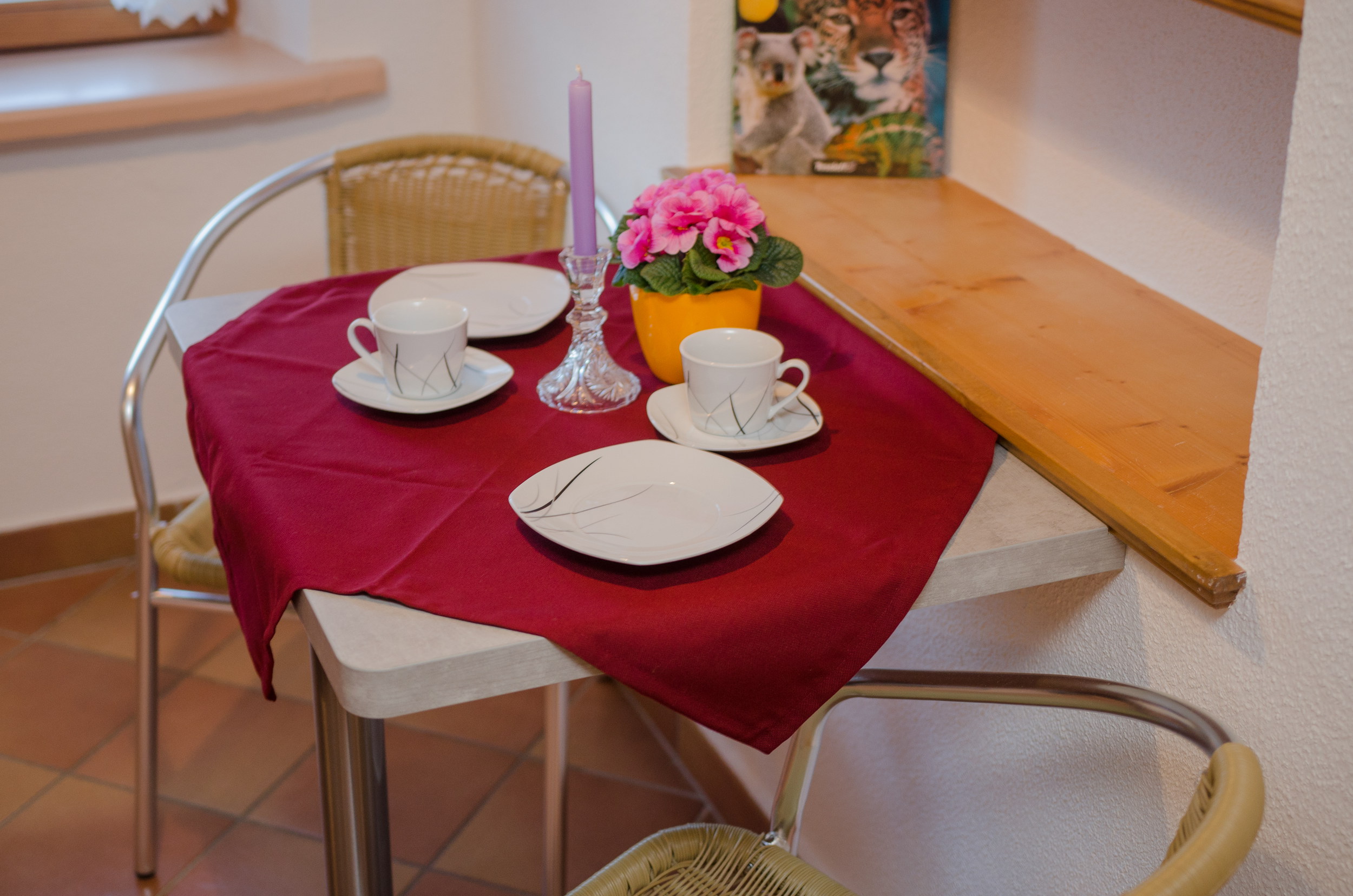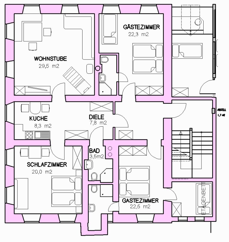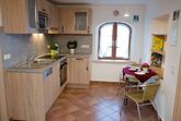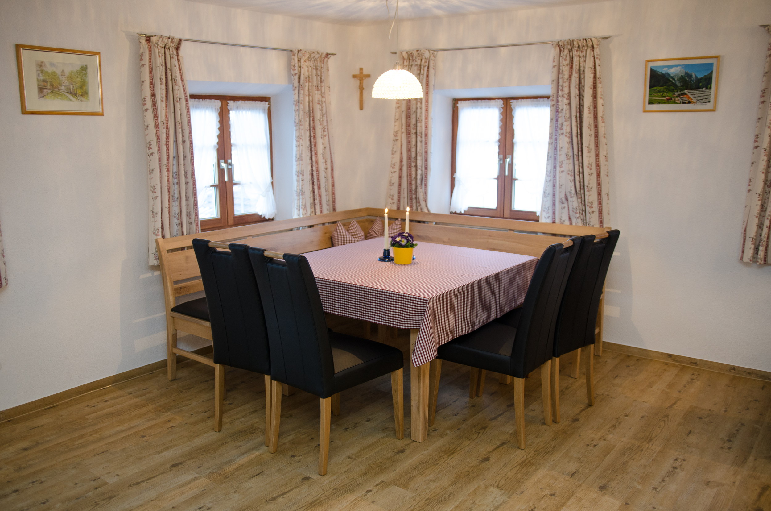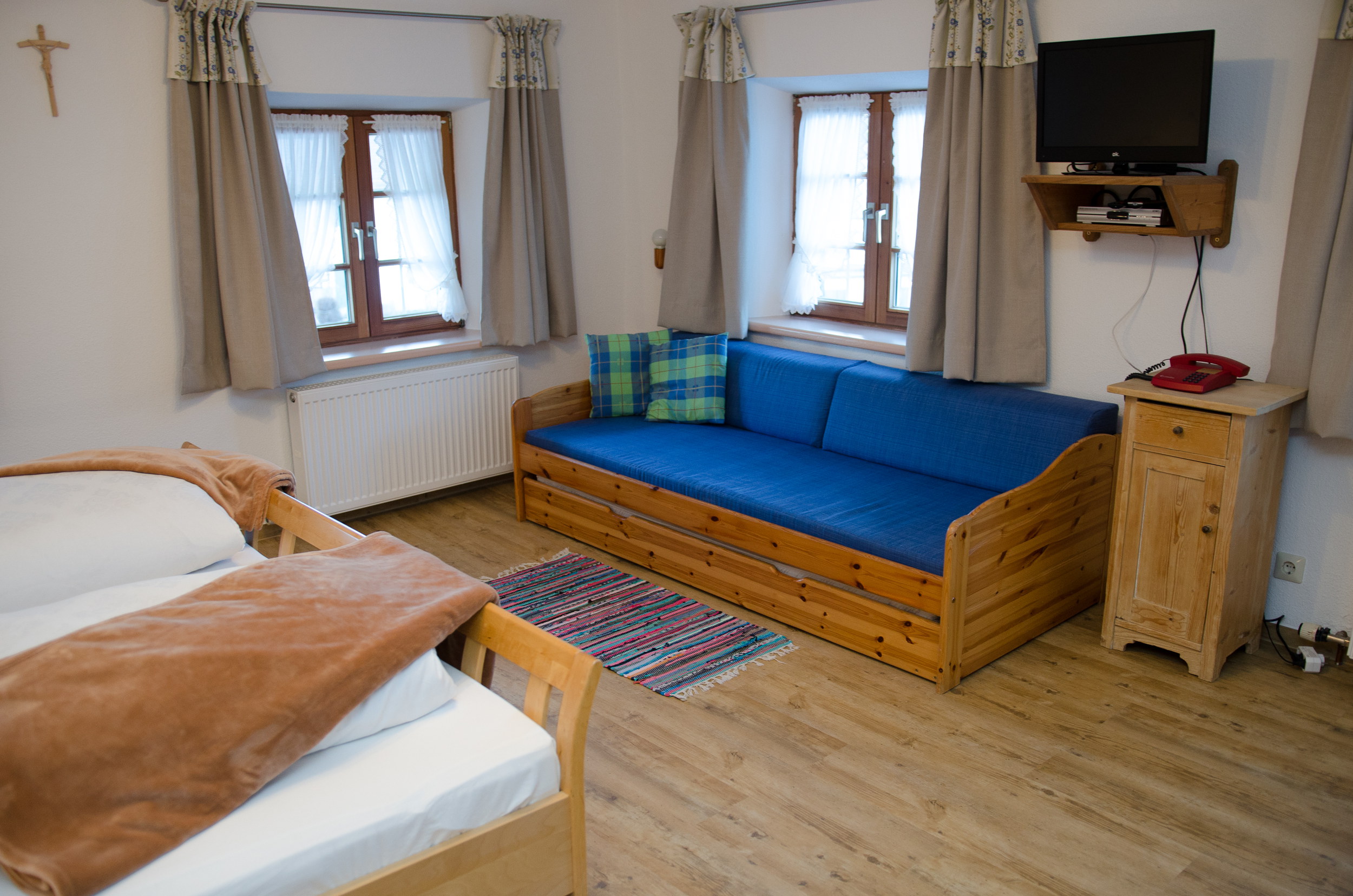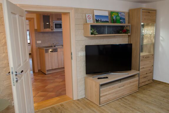 Die Ferienwohnung Dahoam ist komplett neu erstellt und bietet Ihnen auf 70 m² sehr viel Platz für einen entspannten Urlaub. Sie befindet sich im 2. OG auf der Süd-Ostseite des Bauernhauses. Das Schlafzimmer ist ausgestattet mit einem Doppelbett und einer Couch sowie einem TV-Gerät. Für eine besondere Atmosphäre im geräumigen Wohnraum mit großer Sitzecke für bis zu 8 Personen, gemütlicher Couch und Chaiselongue sorgt ein Kaminofen. In der neuen Küche finden Sie eine komplette Ausstattung mit Küchengeräten und ausreichend Koch- und Speisegeschirr. Im neuen Bad mit Fußbodenheizung steht für Sie eine barrierefreie Duschkabine mit Regendusche zur Verfügung. Die Wohnung kann mit den benachbarten zwei Gästezimmern mit jeweils eigener Nasszelle erweitert werden und bietet dann Platz für bis zu 8 Personen.