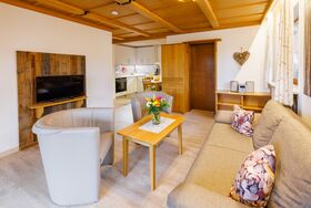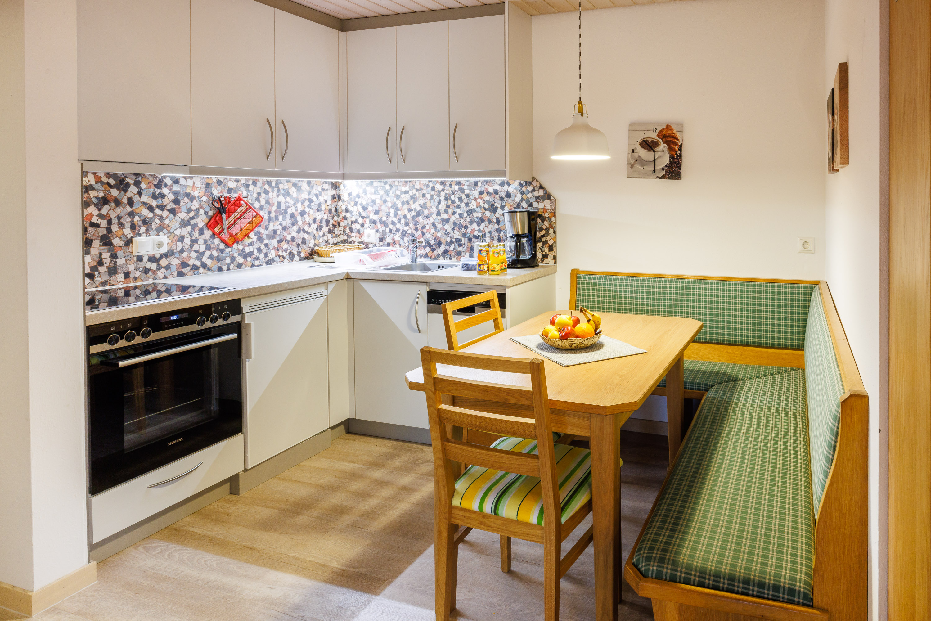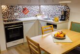 Wohnbereich mit gut ausgestatteter Küche und Essecke,