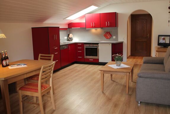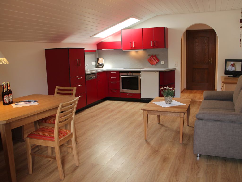 Wohnbereich mit gut ausgestatteter Küche und Essecke,