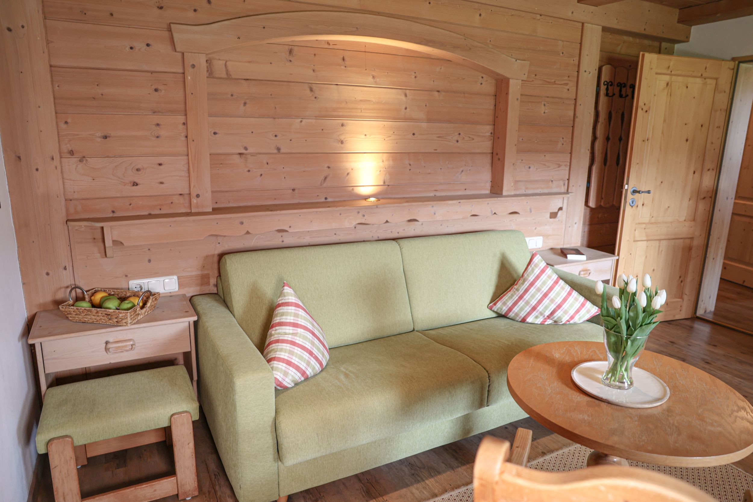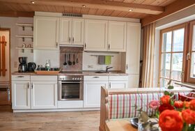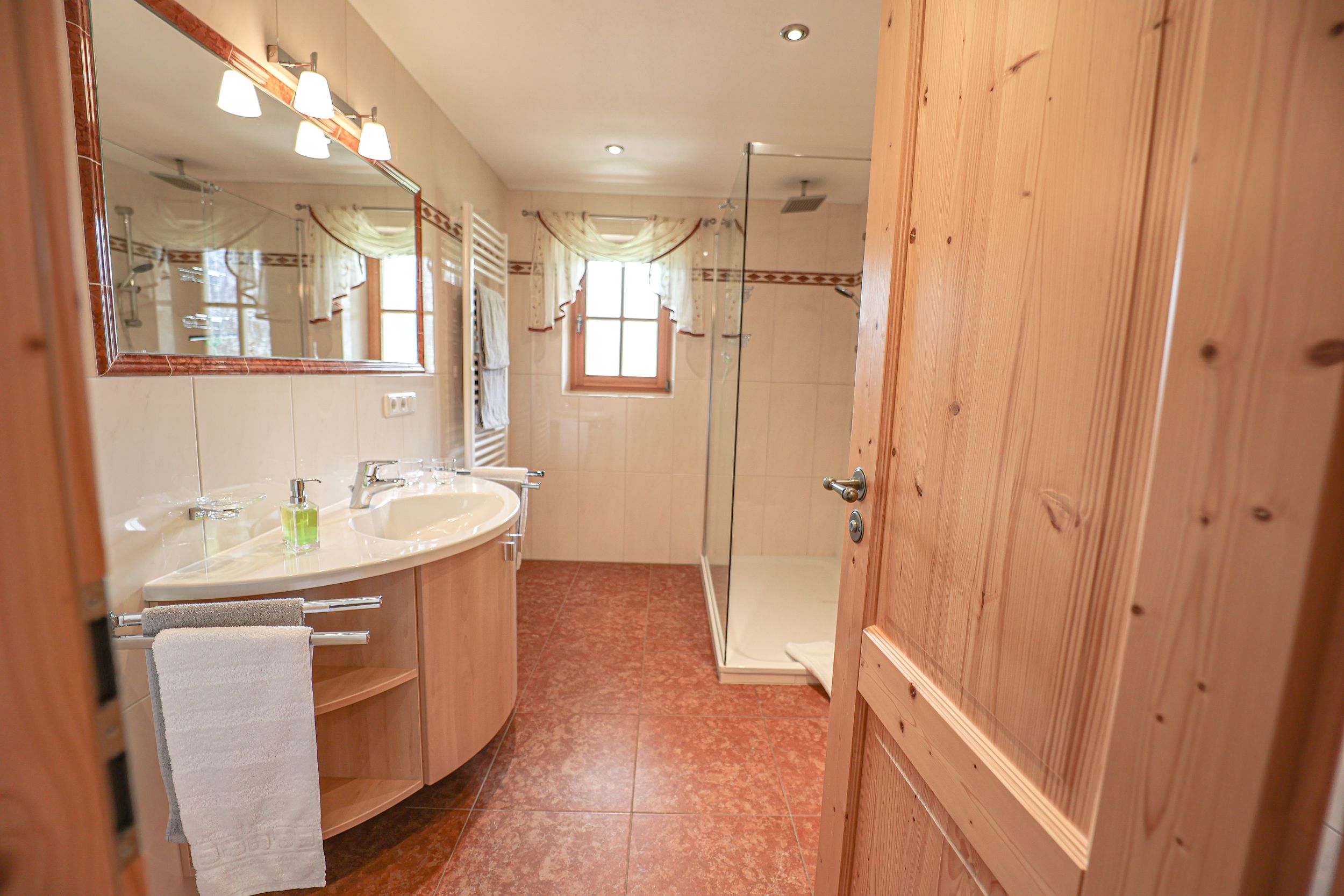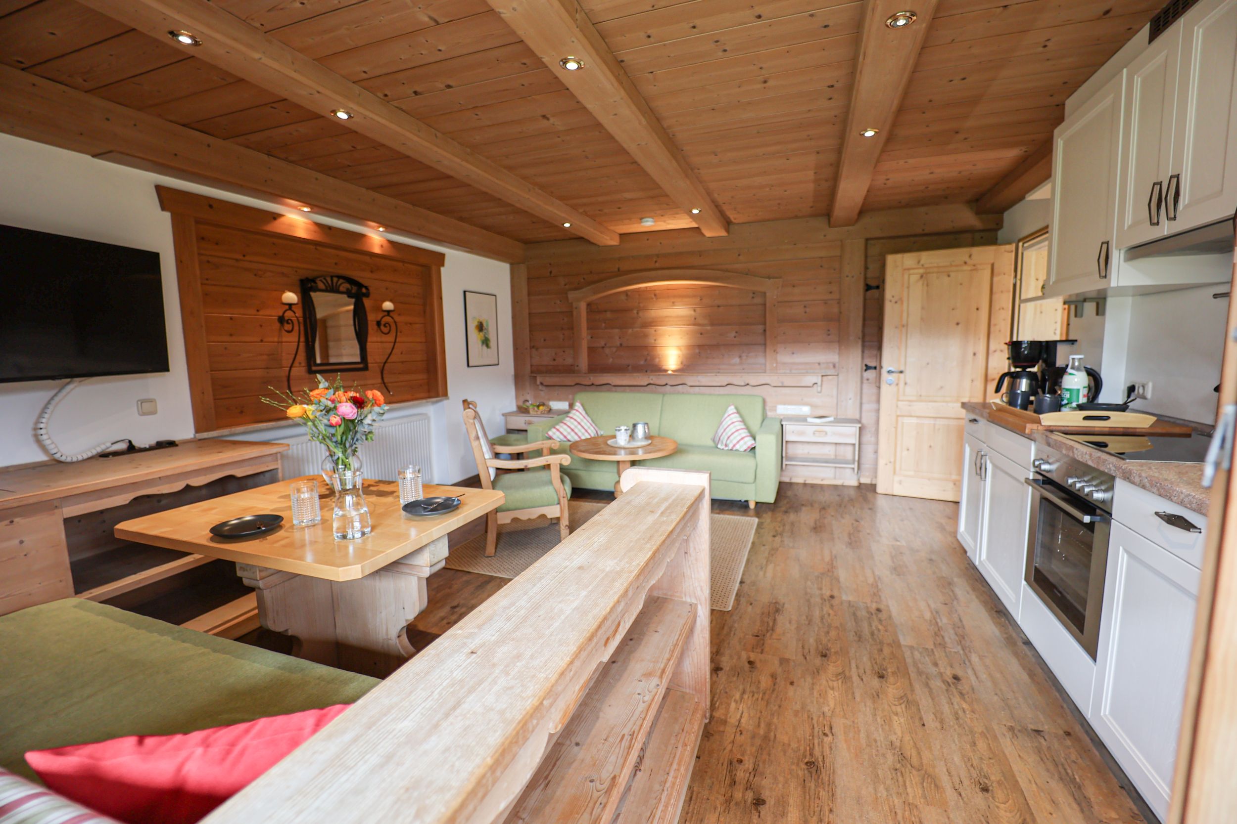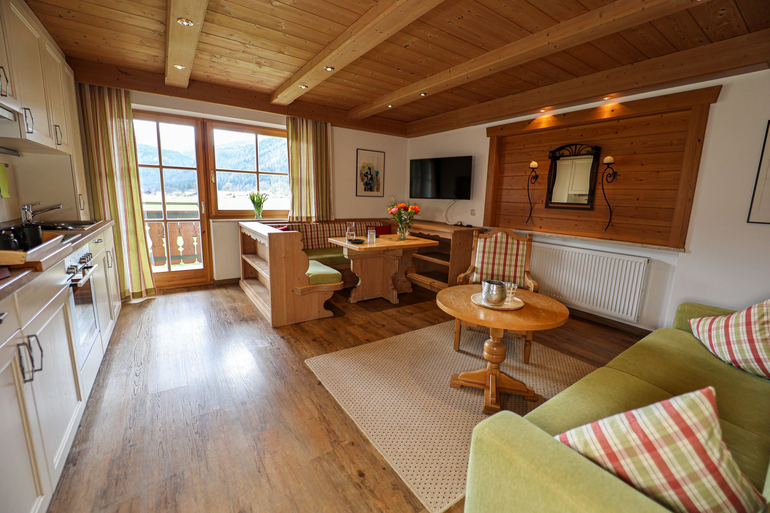 Die Wohnung ist vom Deutschen Tourismusverband (DTV) mit F**** ausgezeichnet!Die mit viel naturbelassenem Holz eingerichtete Wohnung teilt sich auf in einen Eingangsraum; ein separates Schlafzimmer; ein Bad mit Dusche und WC, Waschtisch; einen geräumigen Wohnraum mit Essecke, einer ausziehbaren Couch mit einem Schlafkomfort wie ein Bett und eine Küchenzeile.Die Ferienwohnung Nr. 1 befindet sich im 1. Stock und besitzt einen Süd- und Ost-Balkon mit zauberhaften Blick auf die Berchtesgadener Alpen.