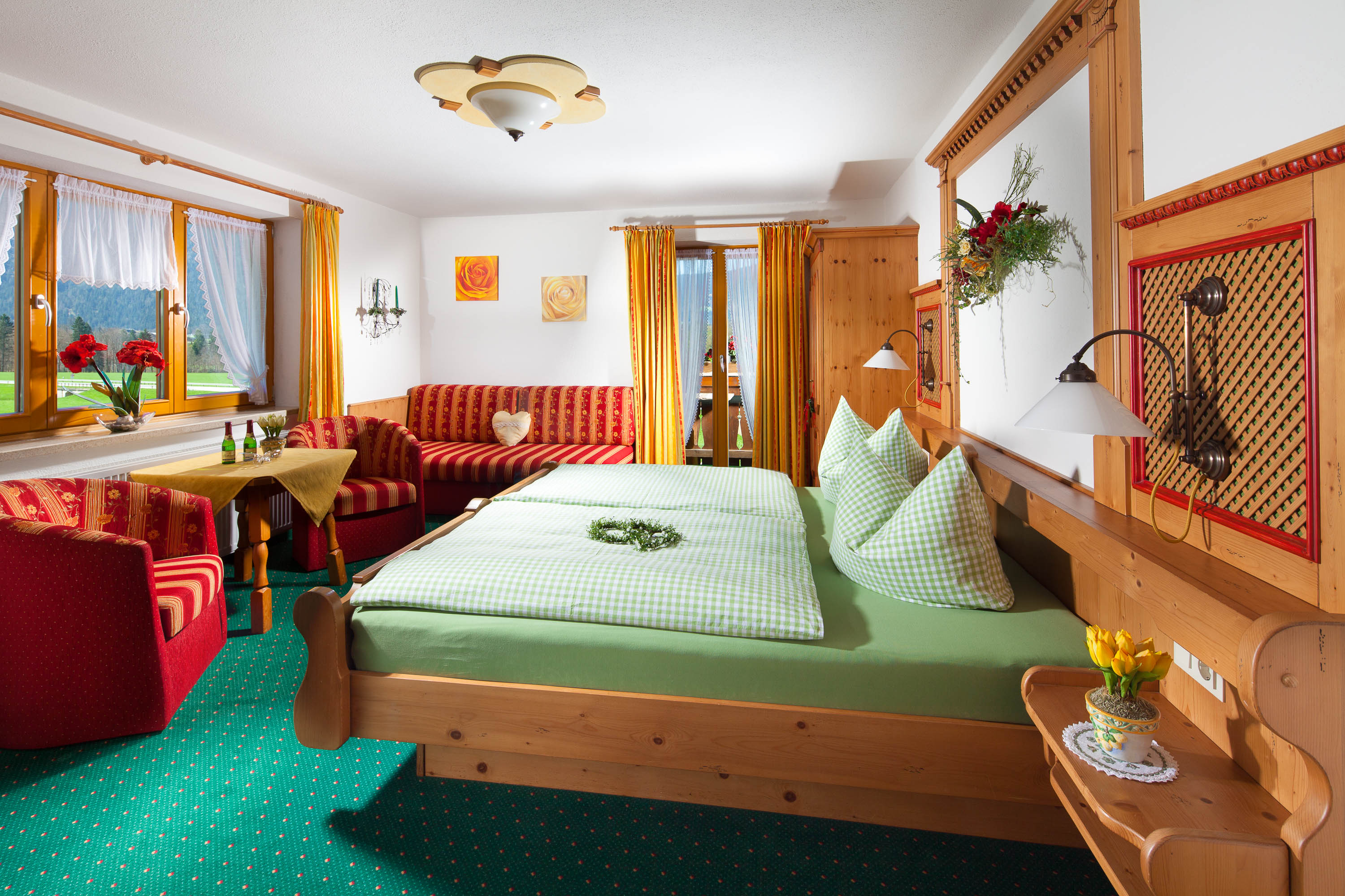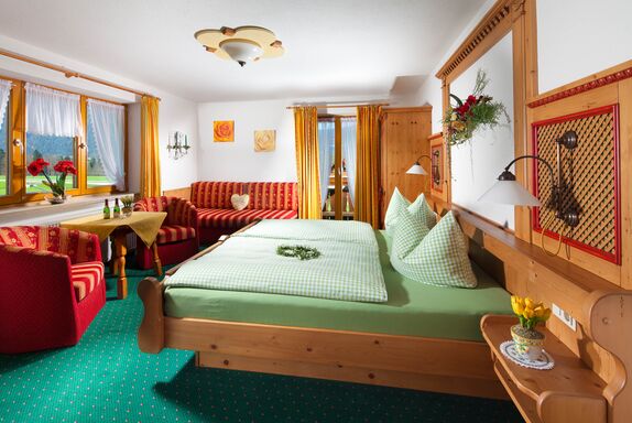 Dieses Nichtraucher-Zimmer liegt im Obergeschoß des Hauses und ist mit hellen Fichtenmöbeln ausgestattet. Es bietet ein Doppelbett, Sitzecke, TV mit Kabelanschluss und ein Bad mit Dusche/WC, Toilettenartikel und Fön. Auf dem Balkon mit Balkonmöbel haben Sie einen fantastischen Blick auf die gesamte Bergwelt.Auf Anfrage und Zuzahlung kann dieses Zimmer auch als Dreibettzimmer gebucht werden.