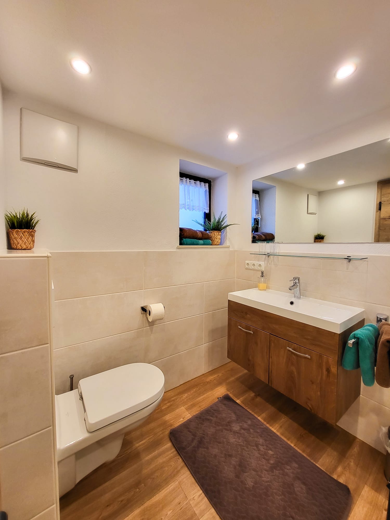Die gemütlich eingerichtete Ferienwohnung liegt im Erdgeschoß und bietet Platz auf 42 qm. Sie verfügt über ein separates Schlafzimmer, eine Küche mit komplett eingerichtetem Küchenblock (2-Platten-Kochmulde, Kühlschrank mit Gefrierfach, Kaffeemaschine, Toaster, Wasserkocher, Eierkocher), einen Wohnraum mit Essecke, Sitzecke, Sat-TV, ein Bad mit Dusche/WC und eine Terrasse mit Gartenmöbel.