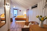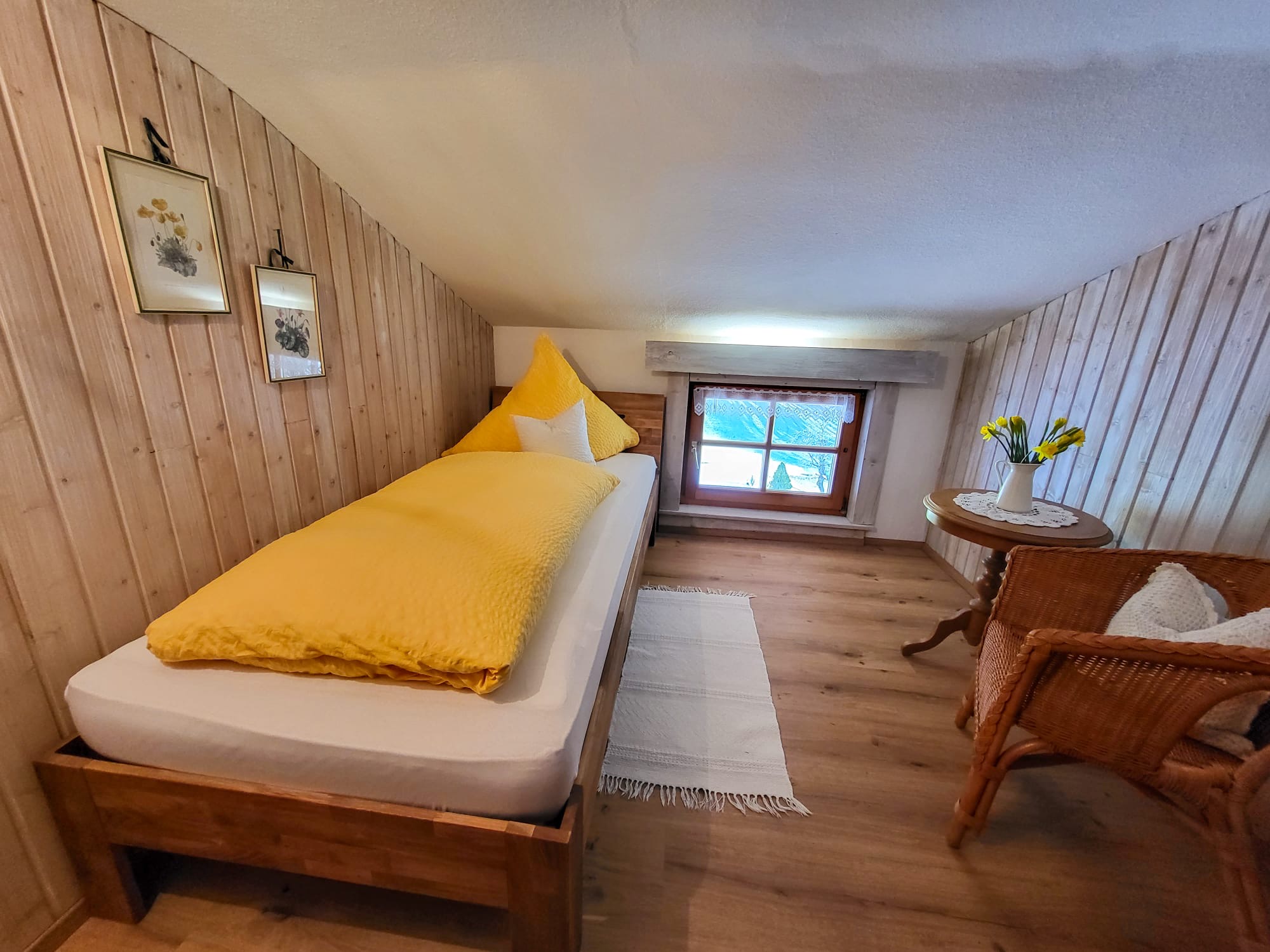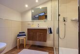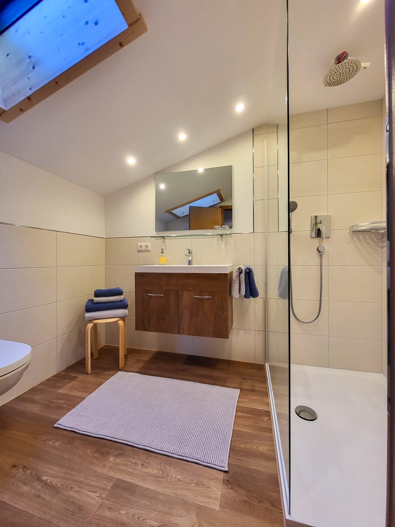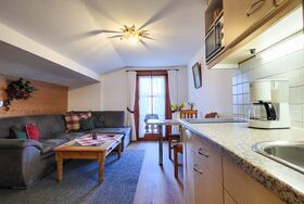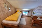 Die gemütlich eingerichtete Ferienwohnung bietet Platz auf 43 qm und liegt im Dachgeschoß. Sie ist ausgestattet mit einem separaten Schlafzimmer, einem kleinen Extrazimmer mit Einzelbett, einem Wohnraum mit komplett eingerichtetem Küchenblock (2-Platten-Kochmulde, Kühlschrank mit Gefrierfach, Kaffeemaschine, Toaster, Wasserkocher, Eierkocher), Essecke, Sitzecke, Sat-TV, einem Bad mit Dusche/WC und einem großen, möblierten Balkon.
