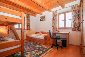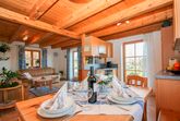 Sie verfügt über eine Küche mit Geschirrspüler und Kapselkaffeemaschine mit optisch abgetrenntem Wohnzimmer sowie zwei separate Schlafräume. Eines mit Doppelbett und das Kinderzimmer mit Etagenbett und extra Einzelbett. Ein Badezimmer mit Dusche befindet sich im 1. Stock.