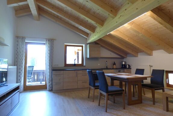 Die gemütlich eingerichtete Ferienwohnung Grünstein liegt im Dachgeschoss unseres Hauses und ist ca. 50 qm groß und verfügt über eine Wohnküche mit Essecke, ein separates Schlafzimmer sowie ein Bad mit Dusche/WC. Sichtdachstuhl in Holzbauweise. Ein großer Balkon zur Westseite bietet einen herrlichen Panoramablick.
