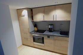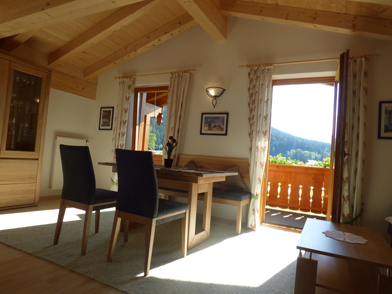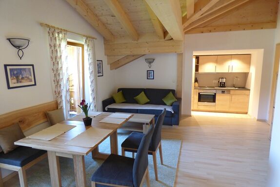 Die gemütlich eingerichete Ferienwohnung Hochkalter liegt im Dachgeschoss unseres Hauses und ist ca. 50 qm groß und verfügt über eine Wohnküche mit Essecke, ein separates Schlafzimmer sowie ein Bad mit Dusche/WC. Sichtdachstuhl in Holzbauweise. Ein großer Balkon zur Westseite bietet einen herrlichen Panoramablick.