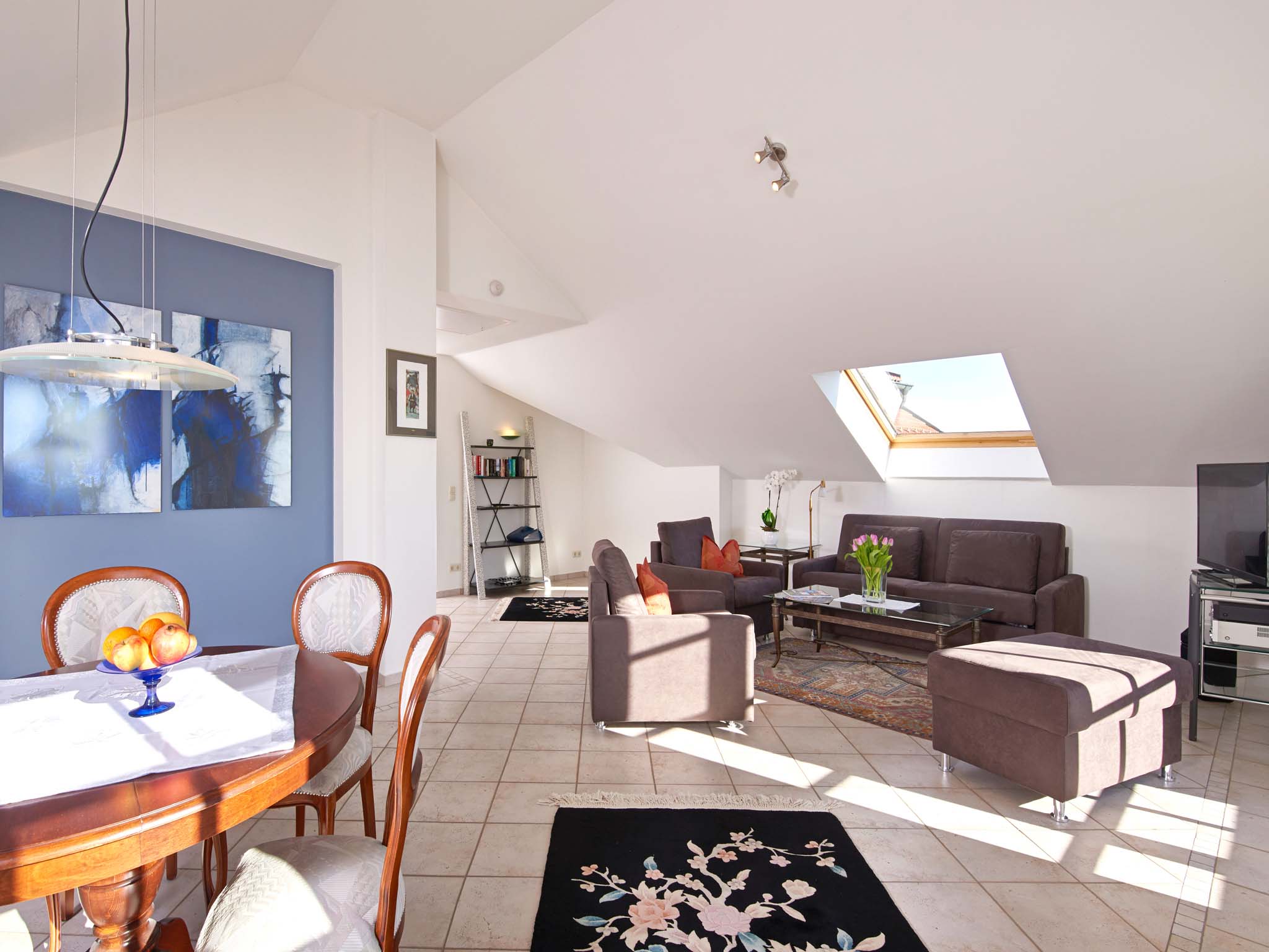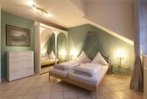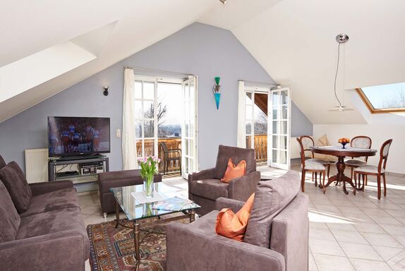 Großzügige Ferienwohnungs-Suite im OG des Haupthauses mit grandiosem Bergblick. Zwei Balkone, komfortables Schlafzimmer, luxuriöses Bad mit Badewanne und Dusche, separates WC mit Bidet und Urinal, Wohnküche, Abstellraum. Moderne Unterhaltungs-, Kommunikations- und Küchentechnik. Verstellbare Lattenroste, Bandscheiben-Matratzen. Umfangreiche Serviceleistungen. Frühstück auf Anfrage möglich.