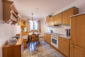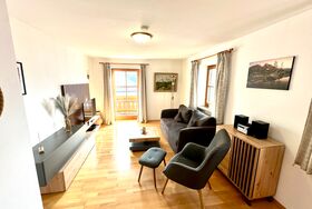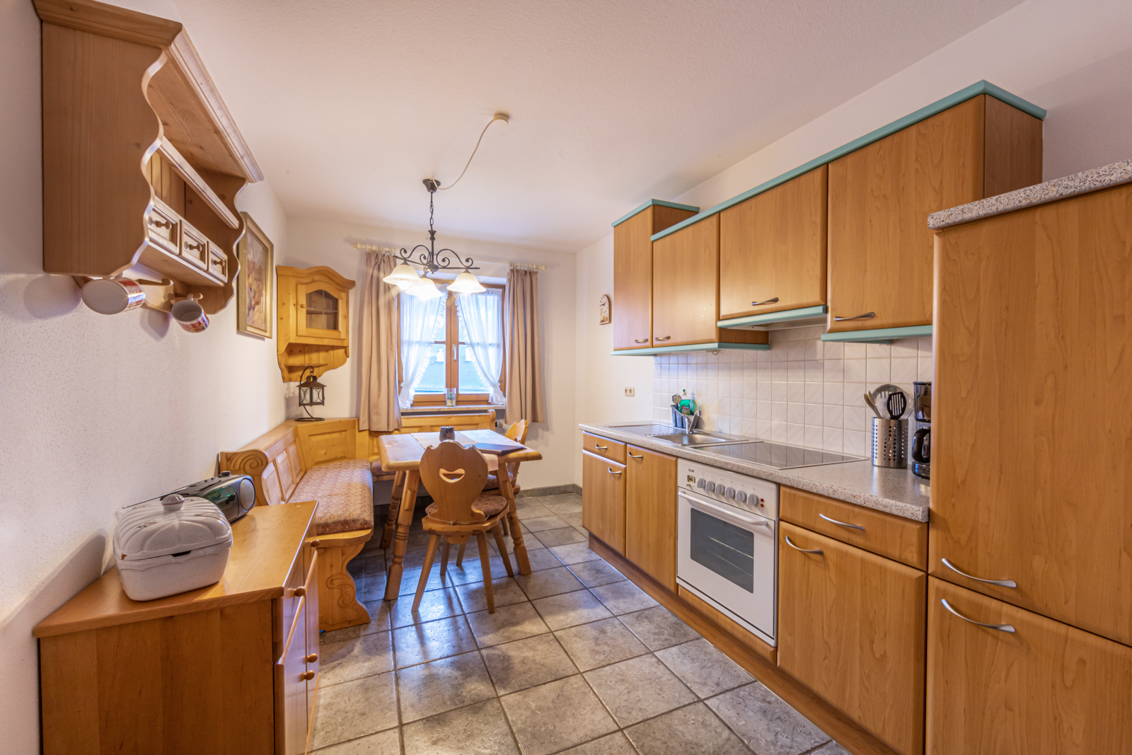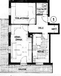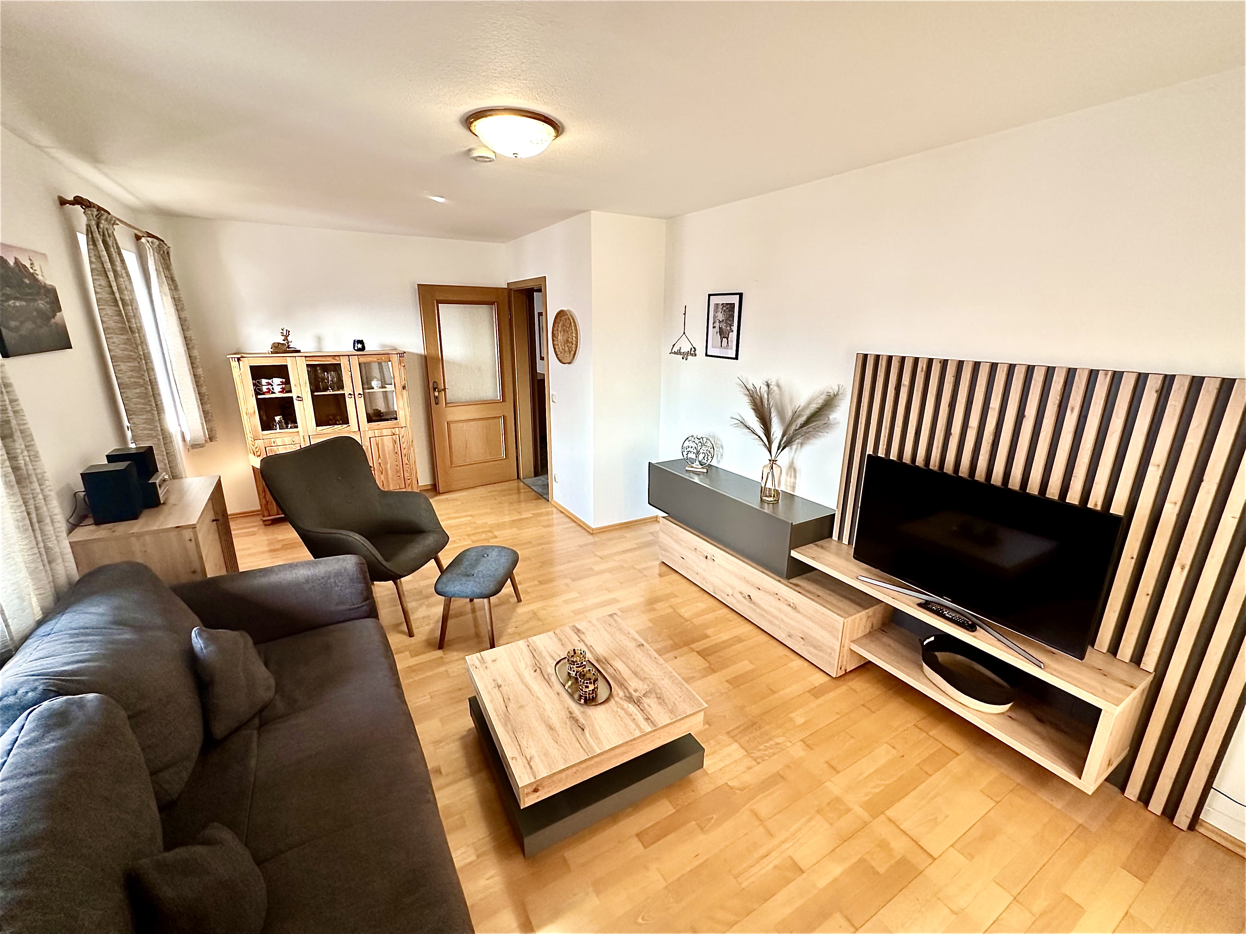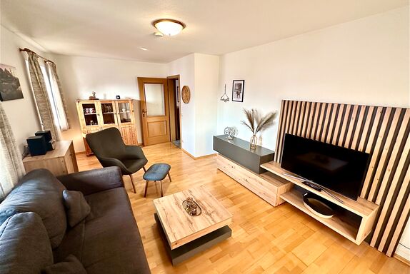 Die komfortable und gemütlich eingerichtete Ferienwohnung (ca. 58 qm) liegt im 2. Obergeschoß. Das Wohnzimmer ist mit einer Schlafcouch, Sat-TV, Radio und einem großen Eckbalkon (Süd-West) ausgestattet. Die Küche verfügt über eine Essecke, einen Herd mit Backofen und Ceranfeld, einen Kühlschrank mit Eisfach, eine Kaffeemaschine, einen Toaster und einen Wasserkocher.
