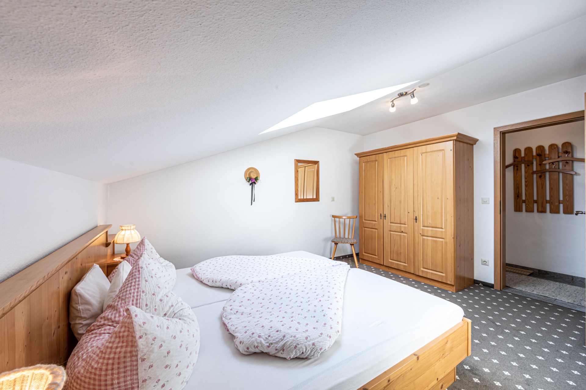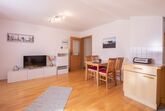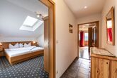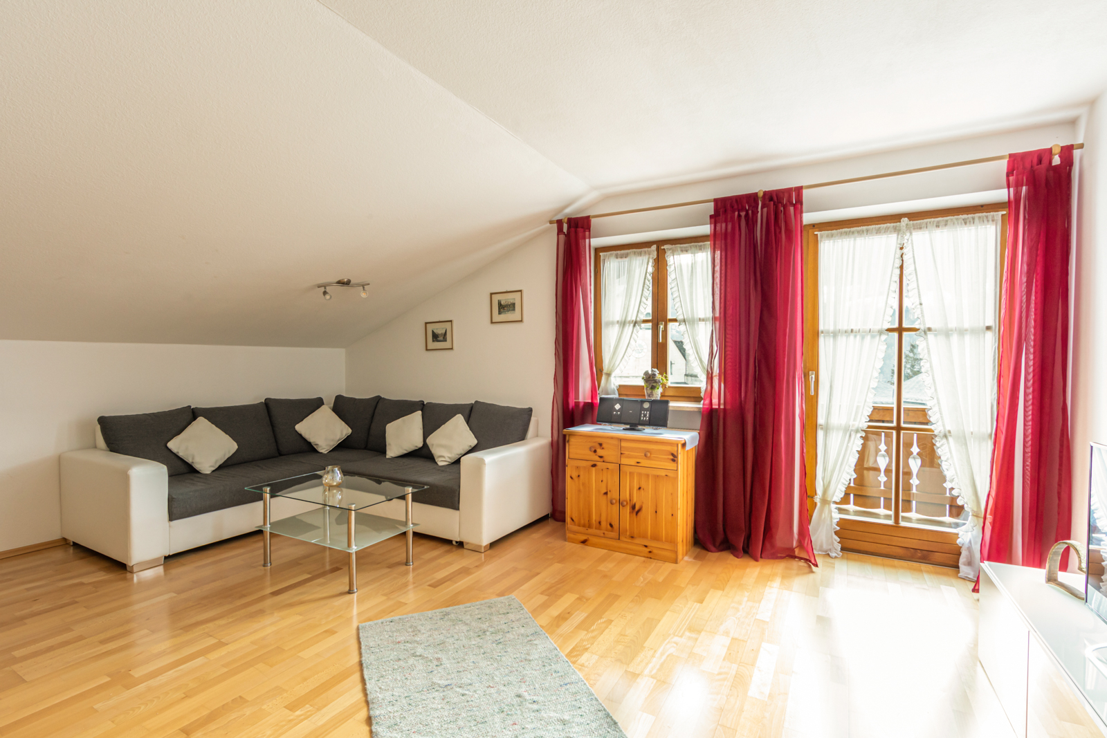 Die komfortable und gemütlich eingerichtete Ferienwohnung (ca. 44 qm) liegt im Dachgeschoß. Das Wohnzimmer ist mit Sat-TV, Radio und einem Balkon ausgestattet. Außerdem verfügt es eine Essecke und eine Küchenzeile mit einem 2-Plattenherd, einem Kühlschrank / Eisfach, einer Kaffeemaschine, einem Toaster und einem Wasserkocher.