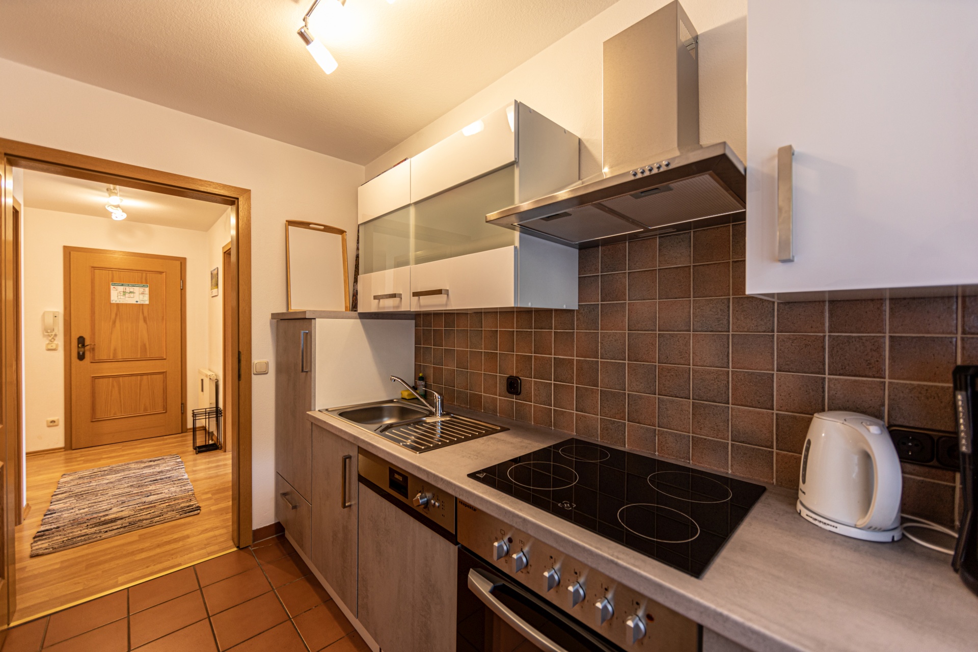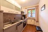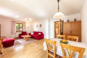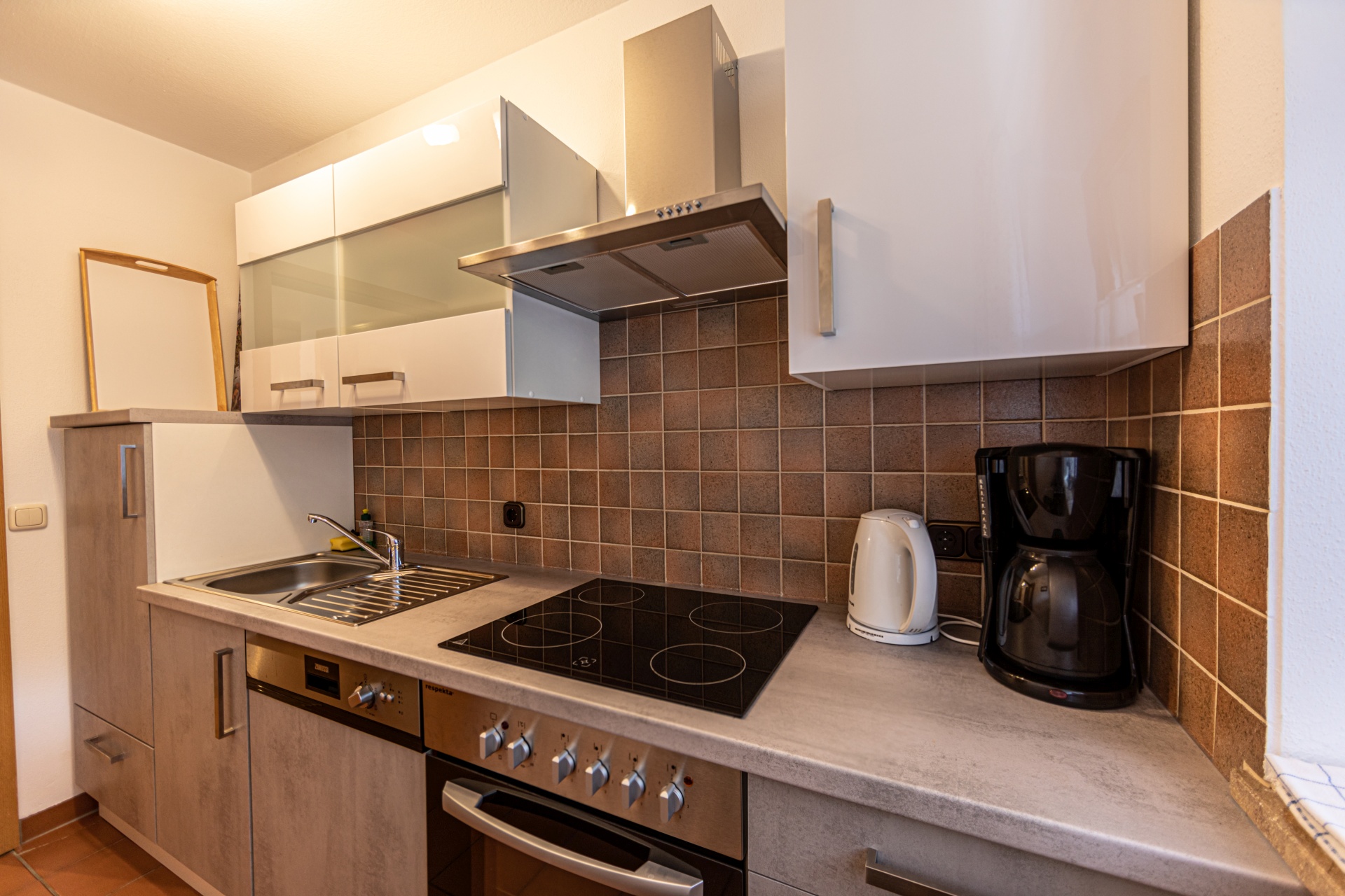 Die komfortable und gemütlich eingerichtete Ferienwohnung (ca. 57 qm liegt im Erdgeschoß. Das Wohnzimmer ist mit einer Doppelschlafcouch, einem Essplatz für 4 Personen und einem Freisitz ausgestattet. Außerdem ist ein Sat-TV und eine Stereo-Anlage vorhanden. Die Küche verfügt über einen Kühlschrank mit Eisfach, einen E-Herd mit Backofen, eine Geschirrspülmaschine, eine Kaffeemaschine, einen Toaster und einen WasserkocheEin Babyreisebett und Kinderhochstuhl können kostenlos zur Verfügung gestellt werden.