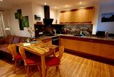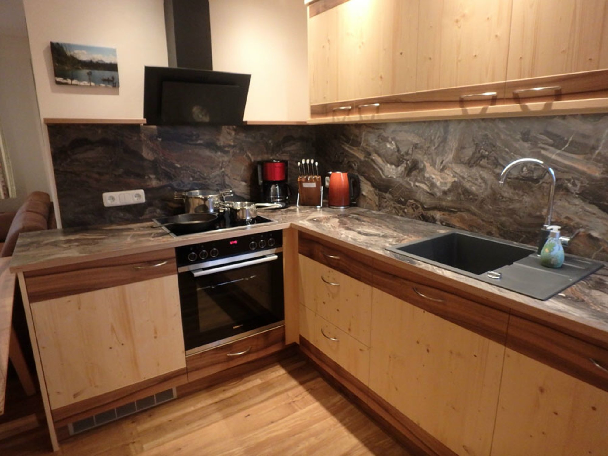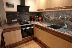 • einer schönen, handgeschreinerten Wohnküche, ausgestattet mit hochwertigen Geräten, wie Backofen, Ceranfeld, Kühlschrank, Mikrowelle, Geschirrspülmaschine, kleinen praktischen Küchenhelfern wie einen Messerblock, Handrührgerät, Eierkocher, Wasserkocher, Kaffeemaschine, Toaster usw.