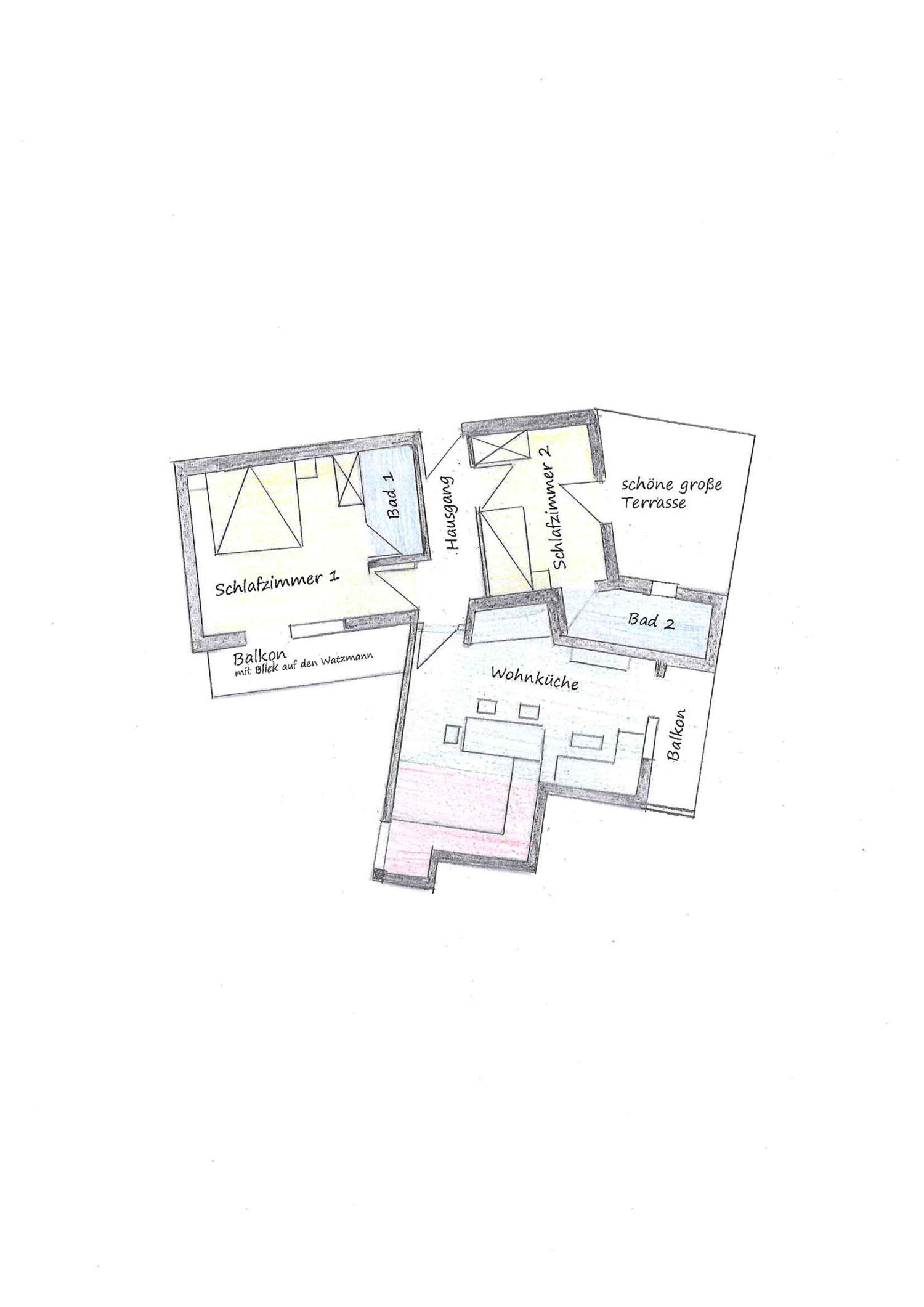 • zwei schönen Balkonen (Süd-Ost-Balkon und Süd-West-Balkon mit herrlichem Blick auf Watzmann und Hochkalter)