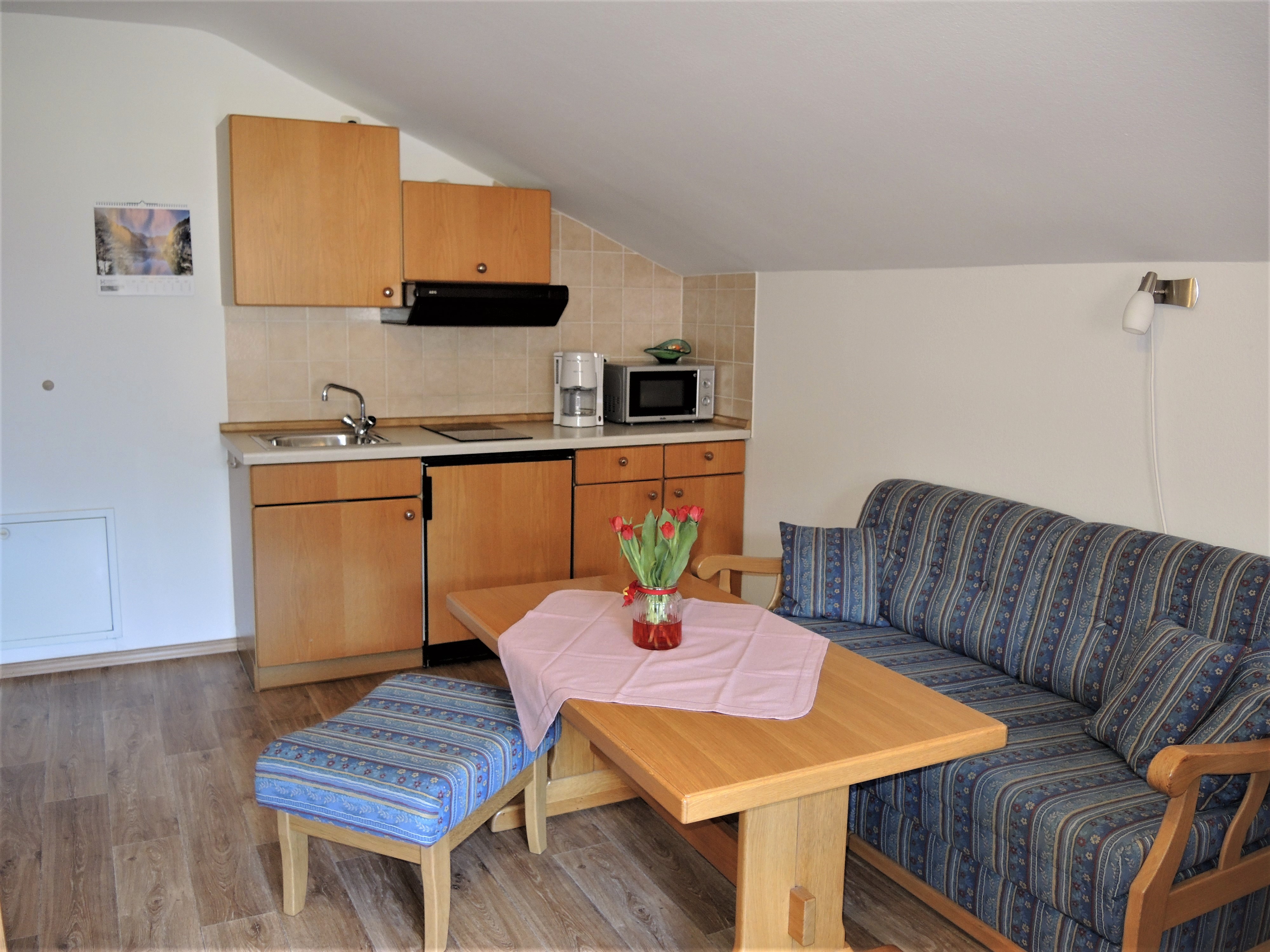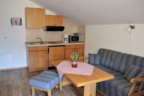 Gemütliche Ferienwohnung mit Südbalkon. Wohnraum mit Küchenzeile, Essecke und Couchgarnitur. Das ausziehbare Sofa bietet Gelegenheit zum getrennt Schlafen. Schlafzimmer mit Doppelbett. Bad mit Dusche / WC, Flur. Näheres siehe Homepage.
