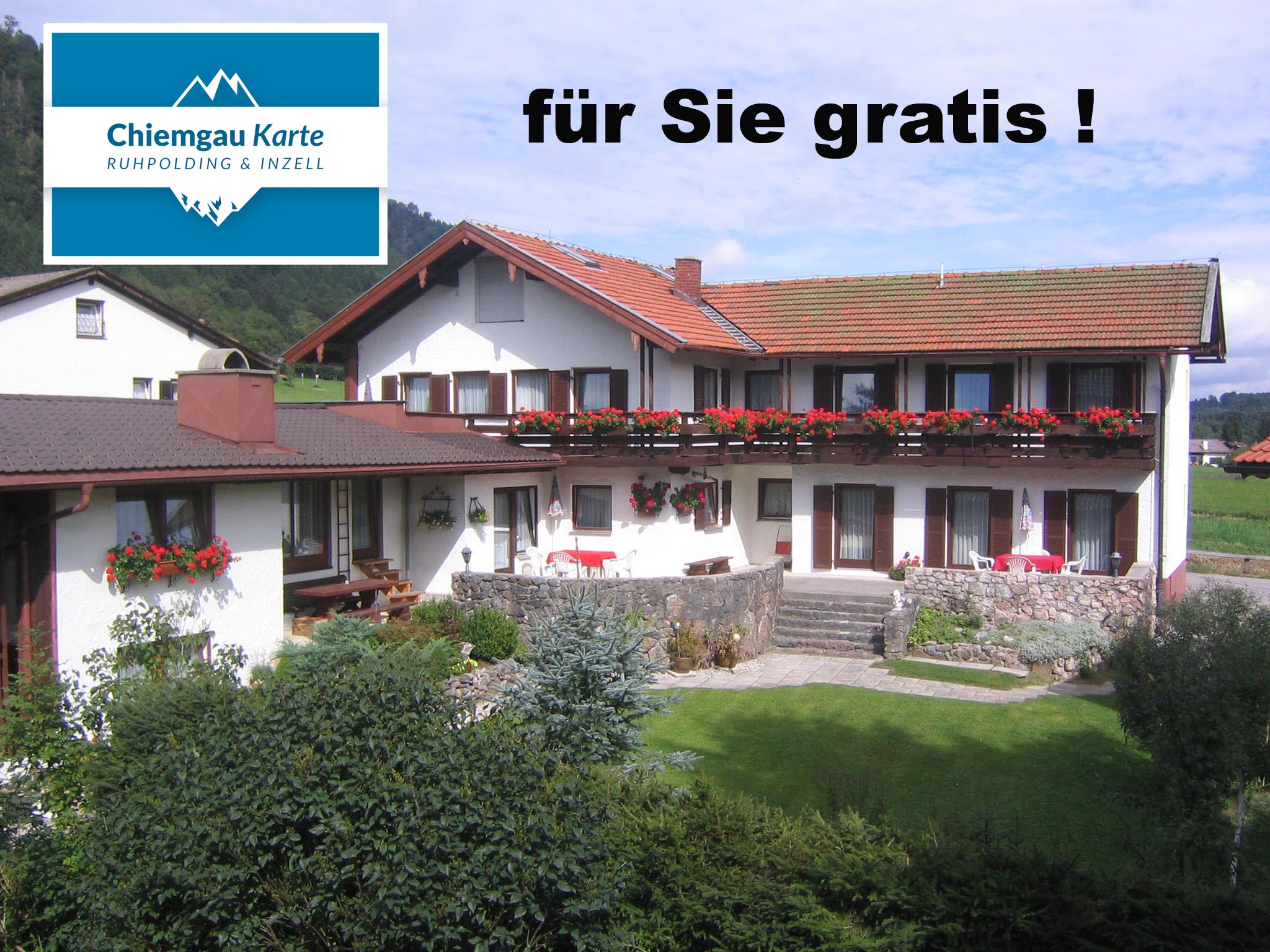 Mit attr. Chiemgau Karte! Unser Haus befindet sich in sonniger Südlage. Es stehen Ihnen vier gemütlich und zweckmäßig eingerichtete Fewos mit Balkon, Dachterr. oder Terr. zur Verfügung (drei Wohn. mit zus. WC).Für weitere Auskünfte stehen wir Ihnen gerne tel. zur Verfügung. Durch die zentrale, aber dennoch ruhige Lage (10 Min. zum Ortszentrum) ist unser Haus der ideale Ausgangspunkt für Wanderungen, Nordic Walking, Radfahren, dem Vita Alpina, Sommerrodelbahn, sowie im Winter zu den Langlaufloipen und Skihängen. Ruhpolding ist die Drehscheibe für Ausflüge nach Salzburg, Berchtesgaden, Kitzbühel, Innsbruck, zum Chiemsee, Altötting, Porsche Museum usw. Gerne geben wir unsere langj. Erfahrung bei der Planung von Ausflügen an Sie als Coach weiter. Wir würden uns freuen, Sie recht bald als Gast in einer unserer Fewos mit einem herzlichen Grüß Gott begrüßen zu dürfen. Stand 16.03.2021 Ihr Vorteil: Wir sind ein Partnerbetrieb der Chiemgau Card | RUHPOLDING & INZELL. Bei Ihrer Anreise erhalten Sie von uns die Chiemgau Card, mit der Sie zusätzlich zu unseren eigenen Leistungen zahlreiche kostenlose Angebote in und um Ruhpolding erleben können, wie z.B. Bergbahnen, Museen, Erlebnisbäder, Skilifte, Führungen, Fahrradverleih, Tennis, geführte Wanderungen, freie Fahrt mit Orts- und Regionalbussen und der Bayerischen Regionalbahn zwischen Ruhpolding und Traunstein und vieles mehr. Die detaillierten Inhalte und Nutzungsbedingungen senden wir Ihnen auf Anfrage gerne zu.