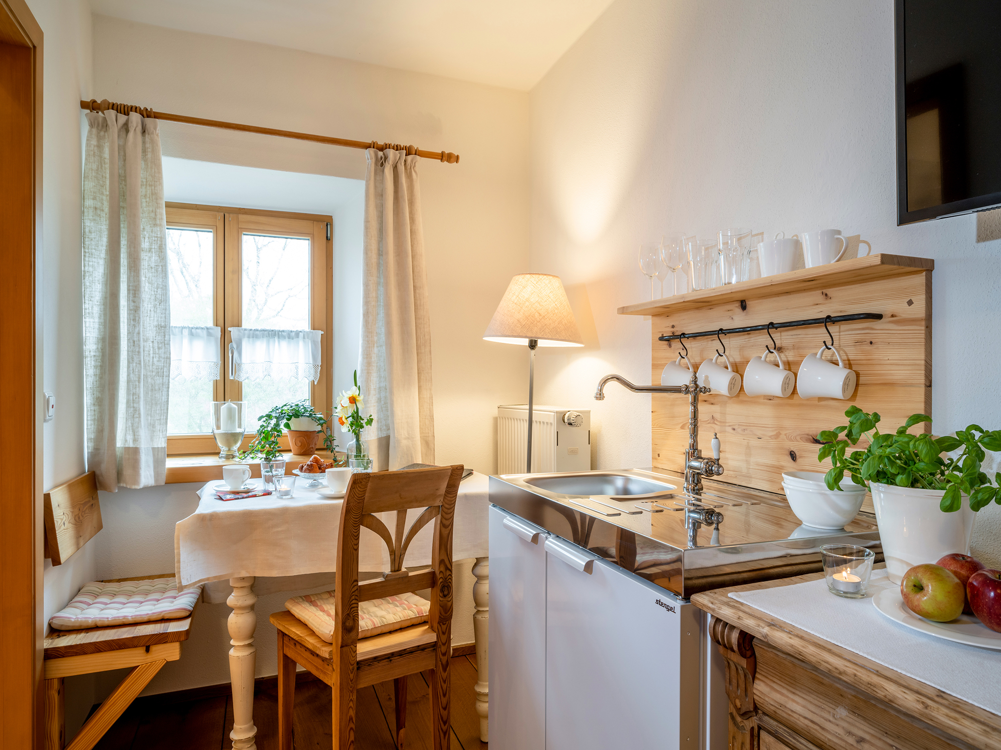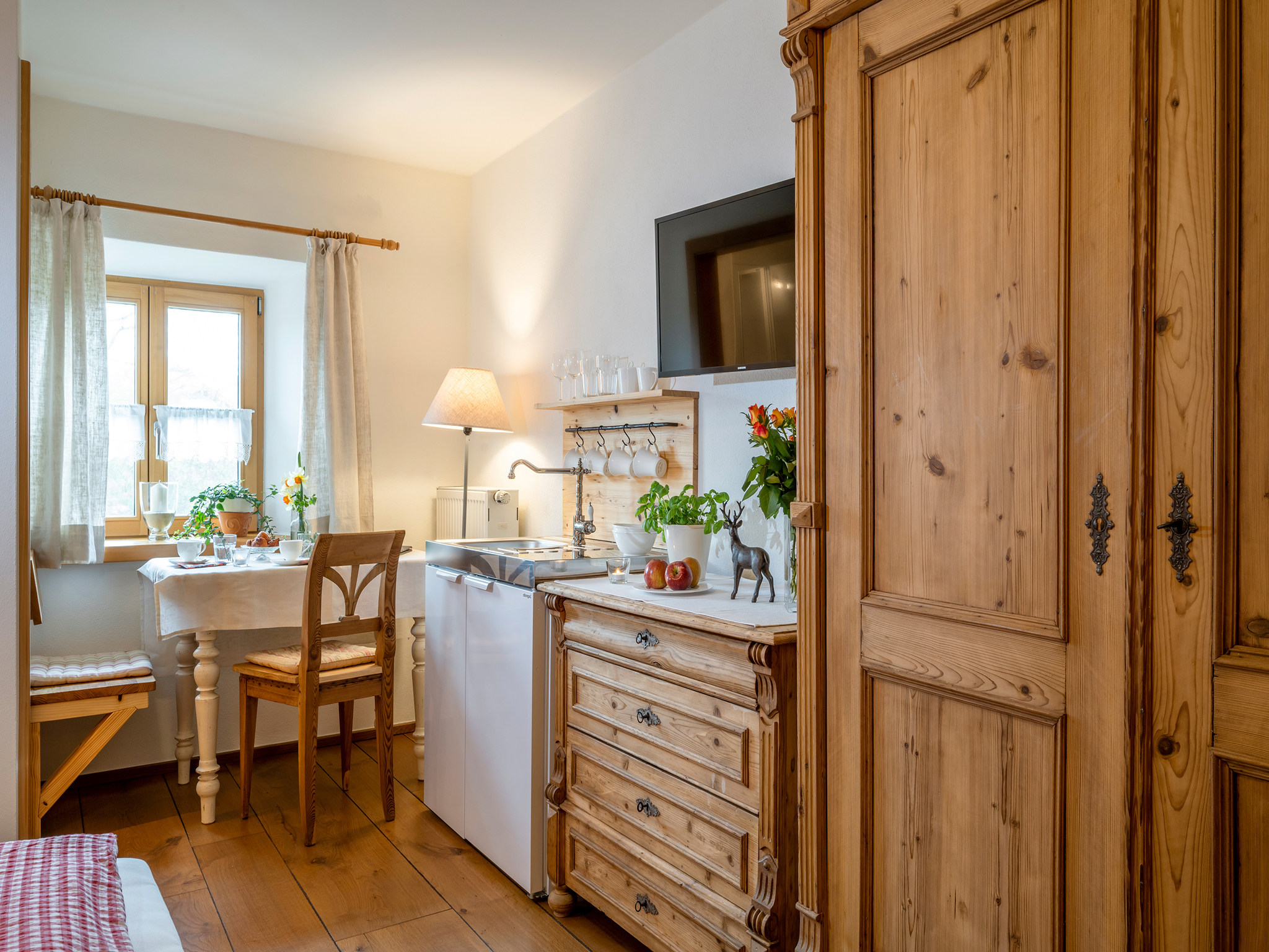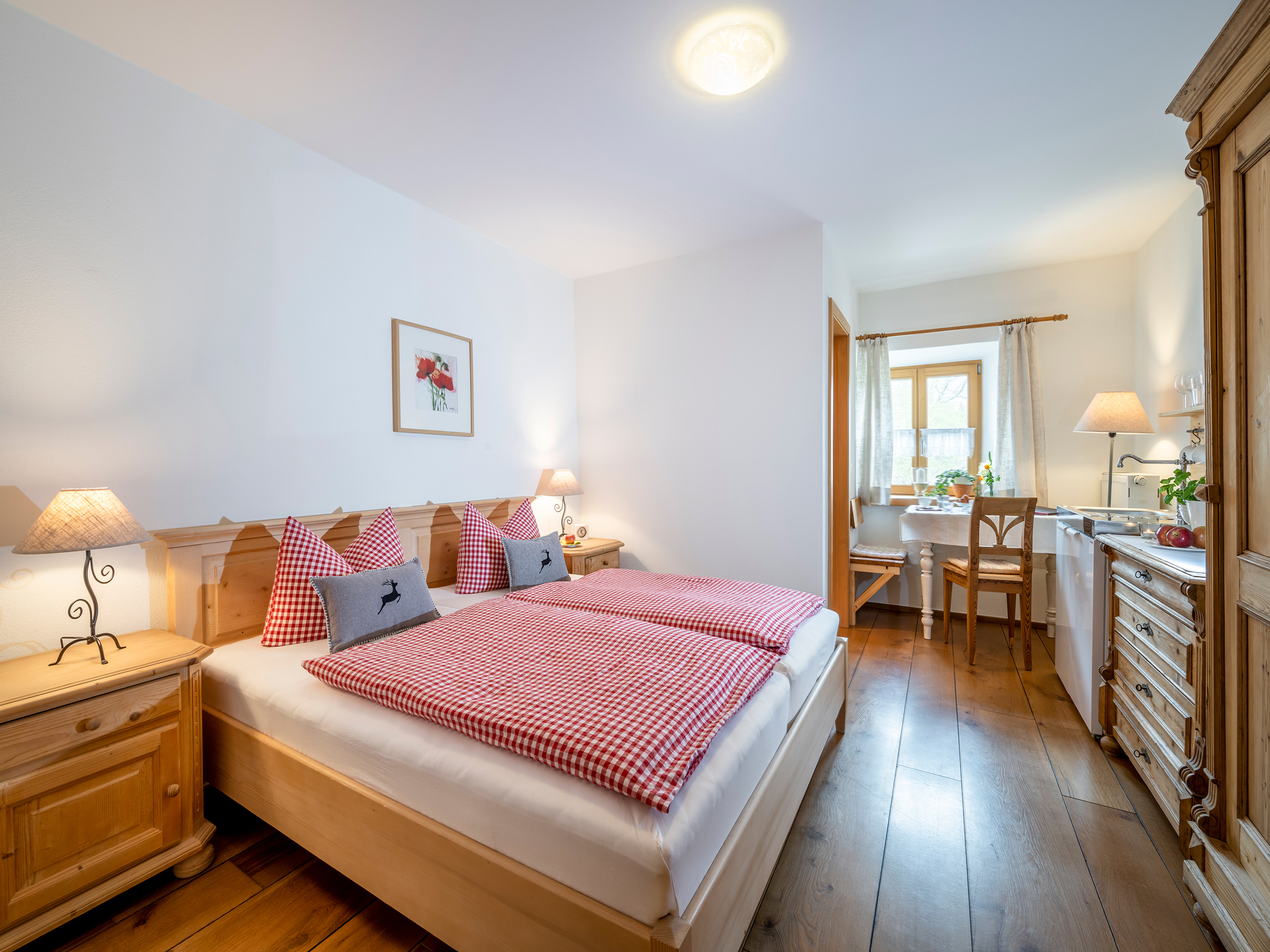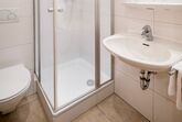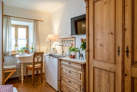 Unsere Hofkammer mit Dusche/WC ist sehr geschmackvoll und gemütlich im Landhausstil eingerichtet. Die Doppelzimmer können außerdem noch als zusätzliche Zimmer zu den Ferienwohnungen dazugebucht werden.