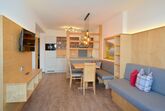 Neu: Apartment mit 3 Zimmern im modernen Landhausstil, Wohnraum mit Eßtischgruppe, Wohnlandschaft und gut ausgestatteter Küche, ein Doppelschlafzimmer und ein weiteres Schlafzimmer mit Doppelbett und Couchliege, 2 x Dusche/WC, Parkettböden und 3 Flat TVs, großer Balkon zur Garten- und Bergseite.