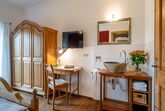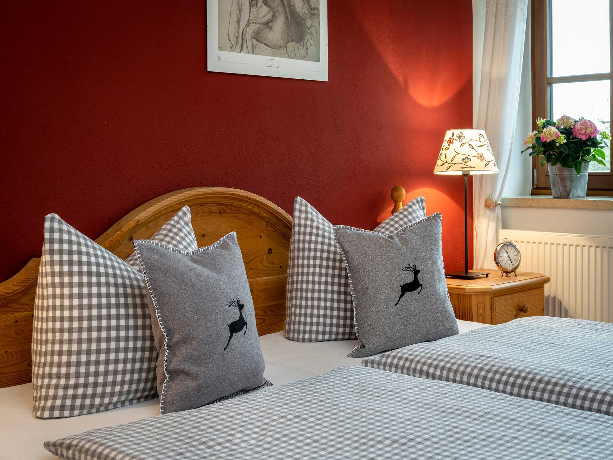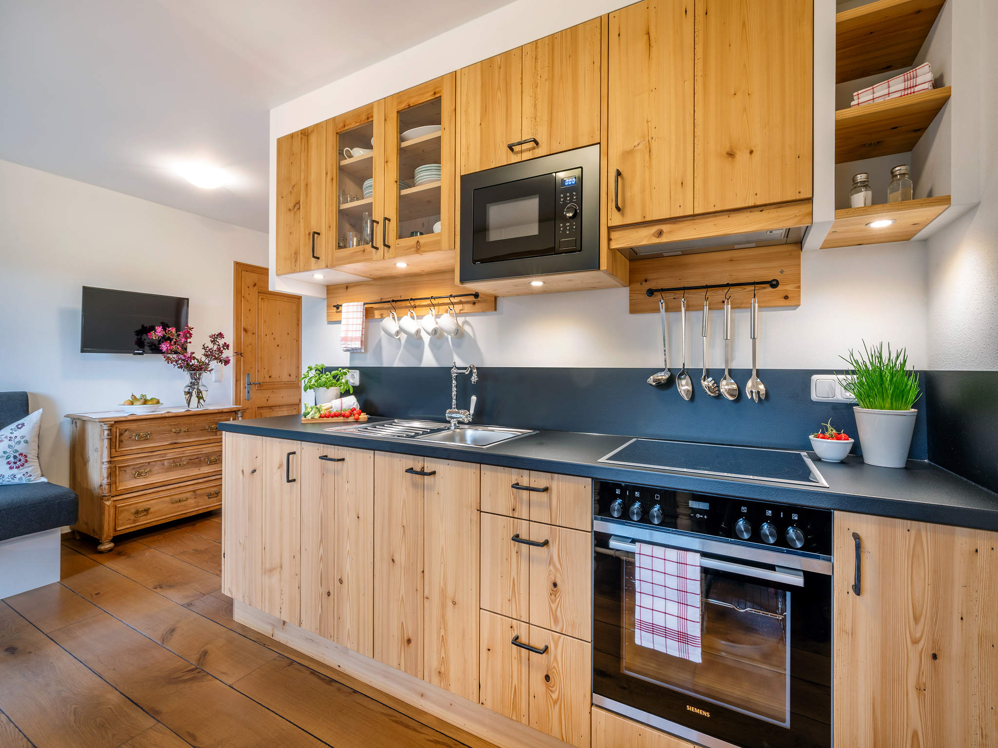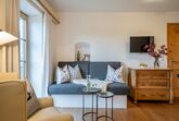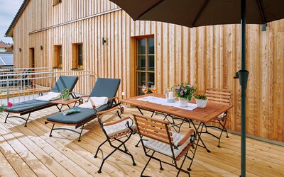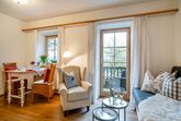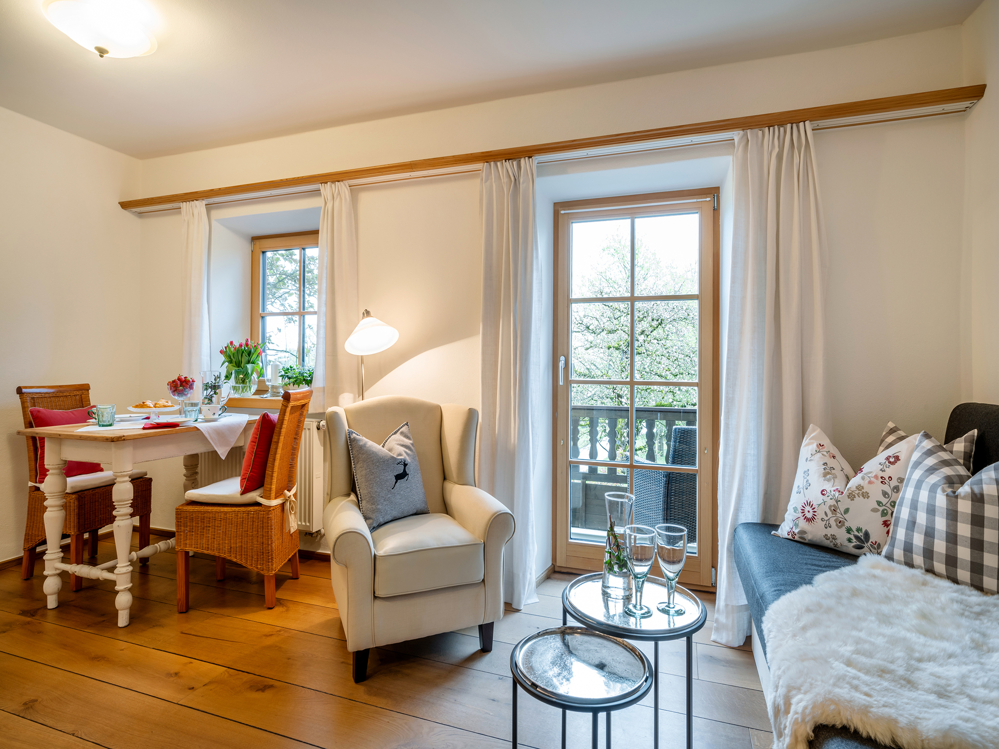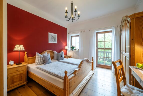 Die 44 m² große Ferienwohnung befindet sich im 1. Stock des Bauernhauses. Der Blick vom Ostbalkon eröffnet einen traumhaften Blick ins Grüne und die Berge. Im großzügigen Wohnraum der Nichtraucherferienwohnung mit gemütlichem Sofa lässt es sich herrlich relaxen. Traditionelle Materialen sowie eine geschmackvolle Ausstattung im rustikalen, ländlichen Stil machen den Wohlfühlcharakter der freundlichen Ferienwohnung aus. Das ist Landurlaub vom Feinsten in einzigartiger Umgebung.