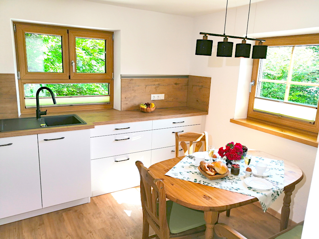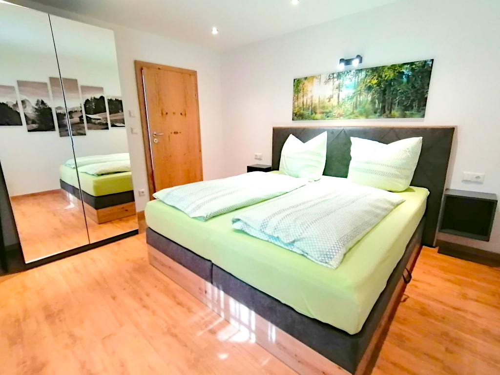 Schöne, ruhige und geräumige Ferienwohnung mit separatem Außentreppen-Zugang. Separates Wohnzimmer mit Schlafcouch und Satelliten-TV, zur Südseite gelegen. Die Wohnung verfügt über einen umlaufenden Balkon mit Sitzgelegenheit und herrlicher Aussicht. Küche mit Spülmaschine, Elektroherd, Backofen, Kühlschrank, Mikrowelle, Toaster, Kaffeemaschine, Eierkocher, Wasserkocher, Kochutensilien, Satelliten-TV und Radio. Badezimmer mit Dusche, WC, Waschtisch und Fön. Schlafzimmer mit Doppelbett, Kleiderschrank, Sitzgelegenheiten und Wecker. Kostenloses WLAN, PKW-Stellplatz, Möglichkeit zum Unterstellen von Fahrrädern.