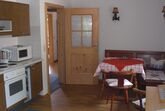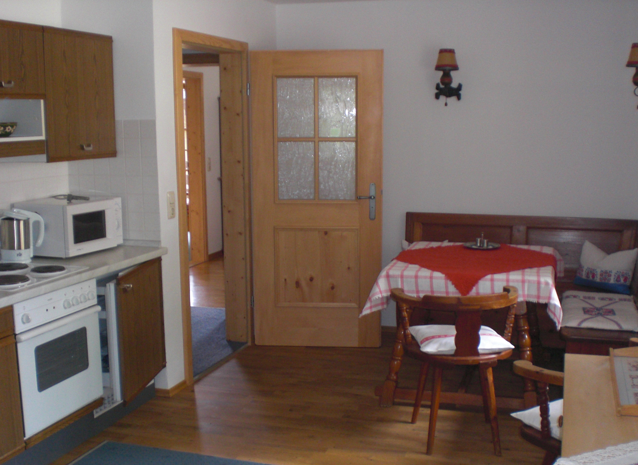 In der Wohnküche mit rustikaler Eckbankgarnitur befindet sich eine Einbauzelle mit Kühlschrank und Gefrierfach, Mikrowelle, Kaffeemaschine, Wasserkocher, Eierkocher und ein 4-Platten-Elektroherd mit Backrohr.