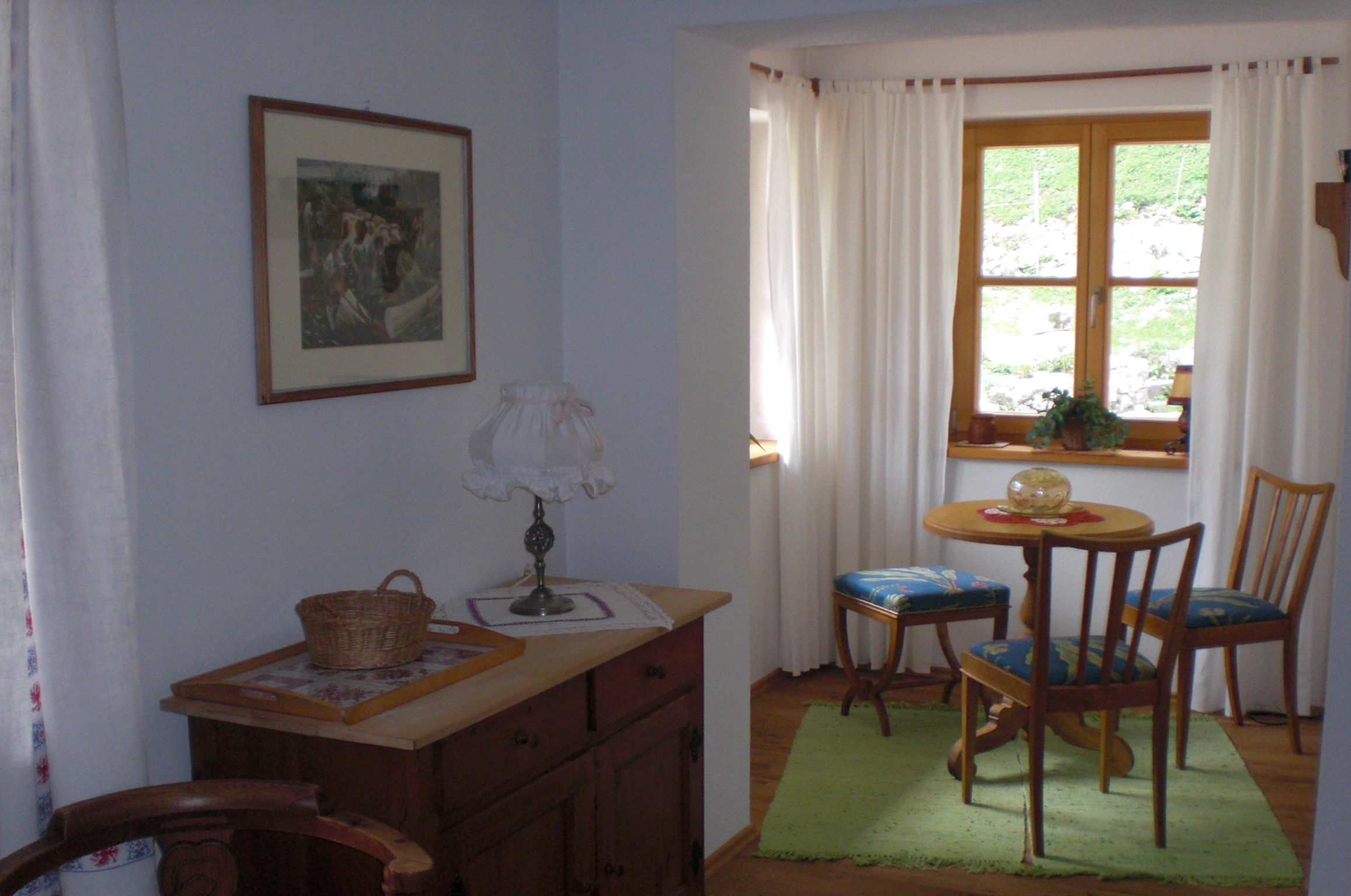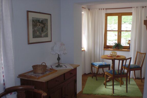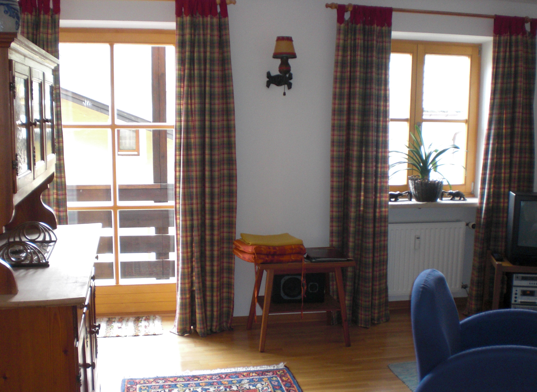 Das Schlafzimmer (ostseitig) ist mit Doppelbett (Matratze aus Naturlatexschaumstoff) im rustikalen Stil ausgestattet, das Wohnzimmer (ost- bzw. südseitig) ist eingerichtet mit Couchgarnitur, Kabel- TV/Radio. Hier befindet sich auch ein gemütlicher Kaminofen.