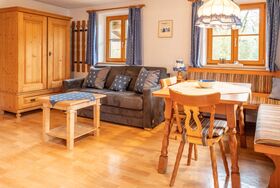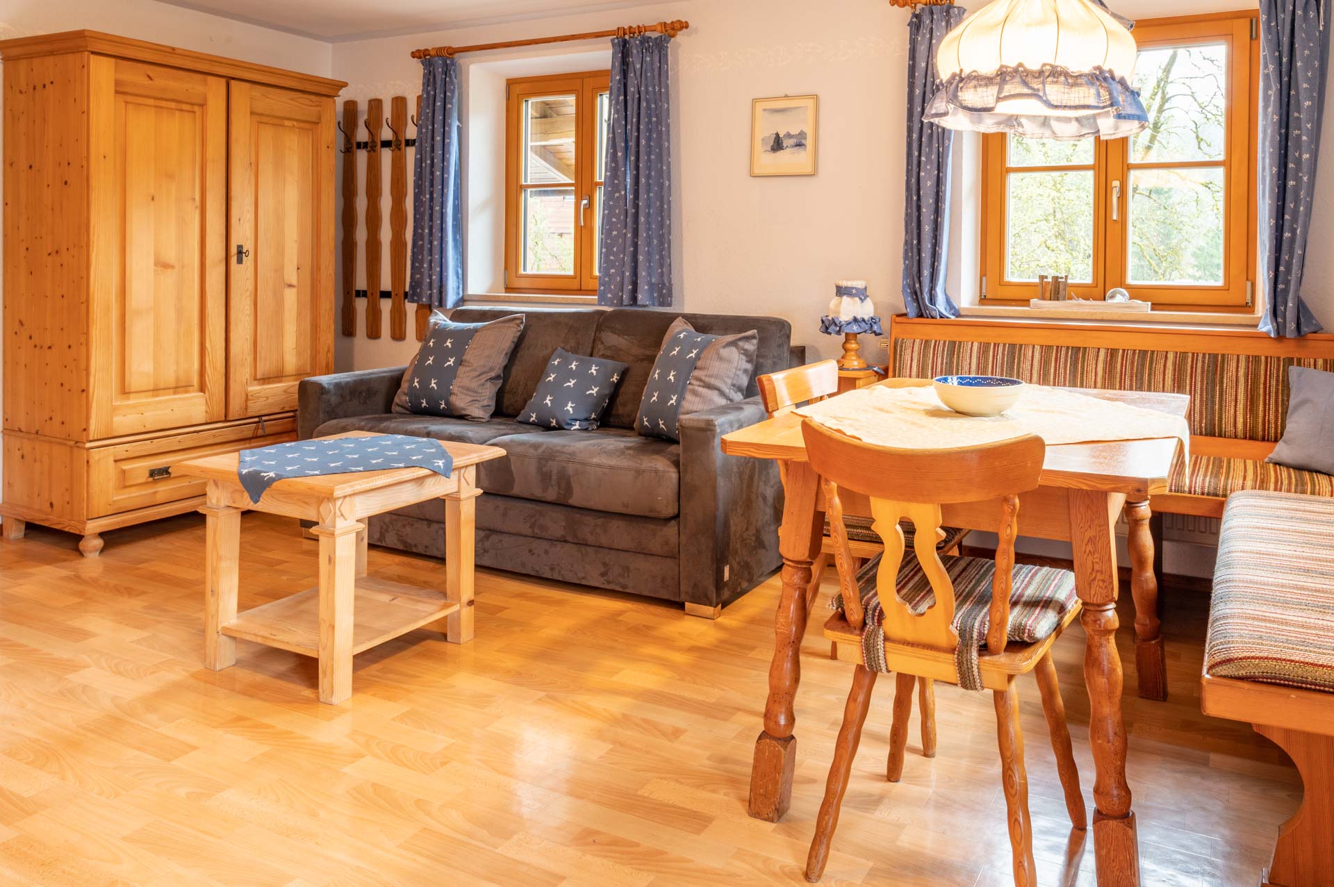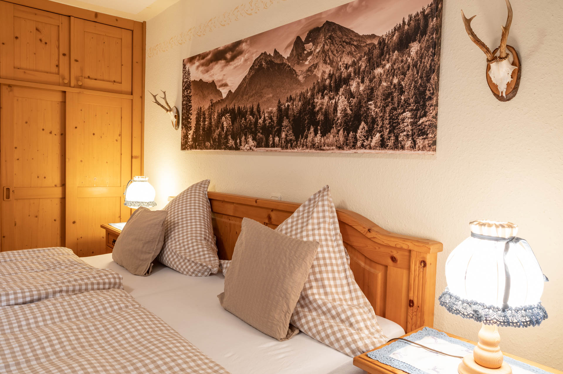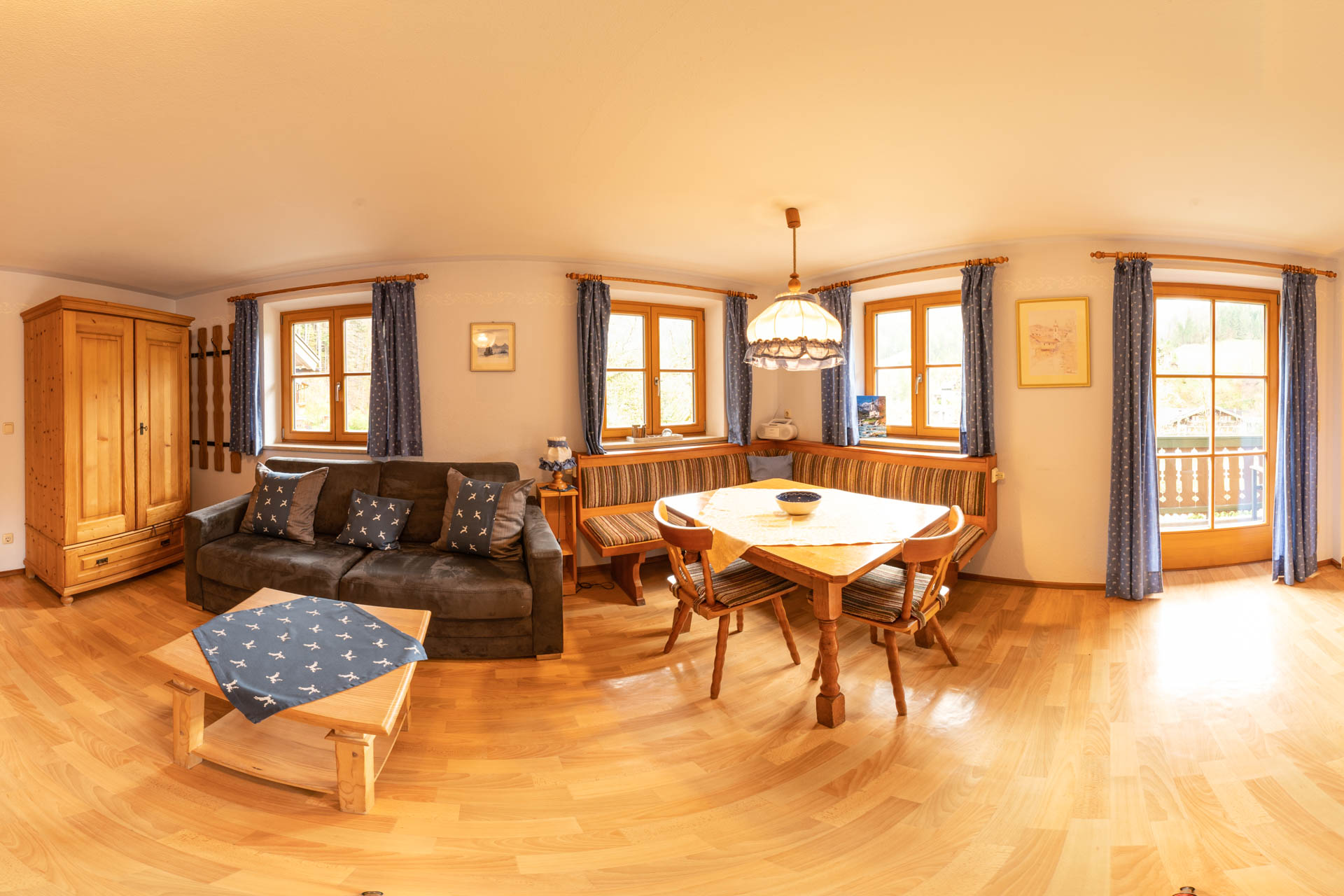 Grandioser Ausblick auf Watzmann, Hochkalter und Reiteralpe, großer sonniger Balkon nach Süd-Osten, vollausgestattete Küche mit rustikaler Eckbank und gemütlichen Sofa (3. Schlafmöglichkeit), Schlafzimmer mit Doppelbett, großzügiges Bad mit Dusche/WC.