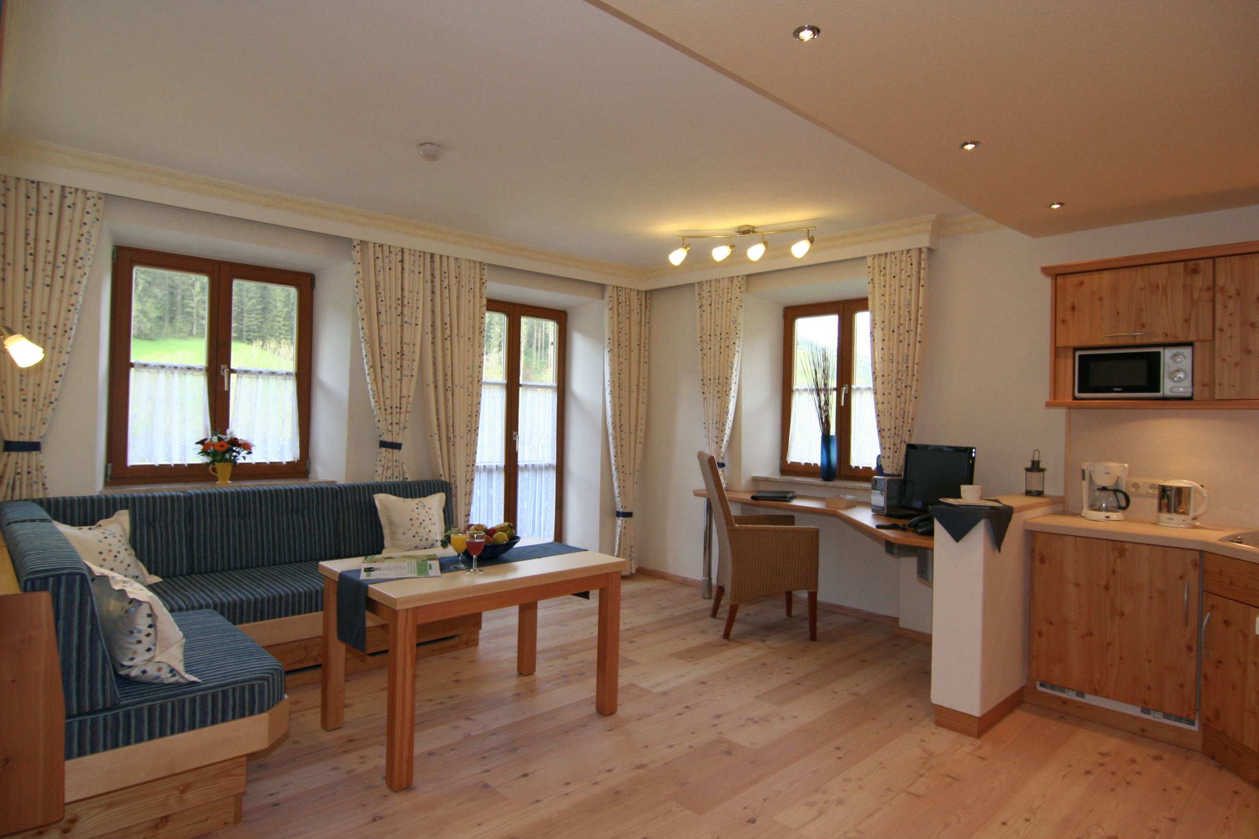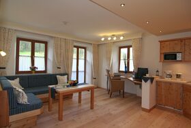 Bergalm-Charakter erleben Sie in unserer Wohnung Steinberg. Ausgestattet in heimischen Lärchenholz mit geöltem Holzboden. Kleine Wohn-Küche mit Kühlschrank, 2-Platten-Cerankochfeld, Spülmaschine und Microwelle, große gemütliche Sitzcouch, Eßtisch mit Sitzgelegenheit, Telefon, Flachbildschirm mit SAT-TV, Garderobe mit Ganzkörperspiegel. Das Schlafzimmer ist mit einer Schiebetüre abgetrennt und ebenfalls mit Lärchenmöbel ausgestattet hat Verdunkelungs-Vorhänge und einen Zimmersafe. Das Appartement Steinberg verfügt über einen Süd-Westbalkon mit Blick auf Reiteralpe, Watzmann und Steinberg. Das Badezimmer ist ausgestattet mit hochwertigen Materialien, verfügt über einen Granit-Waschtisch mit viel Ablagefläche, einen großen Duschbereich, WC, Fön, Kosmetikspiegel und Handtuchtrockner. Durch ein Fenster zum Schlafzimmer haben Sie auch im Bad natürliches Tageslicht.