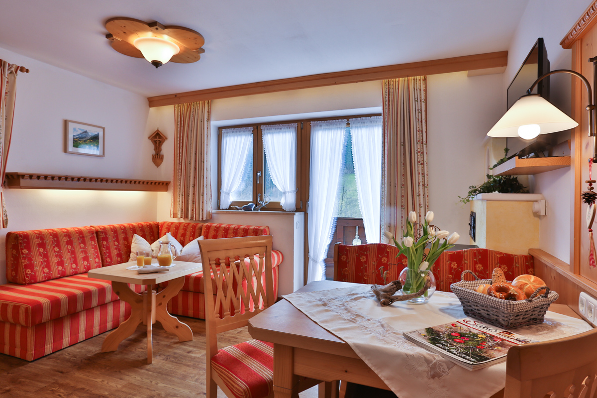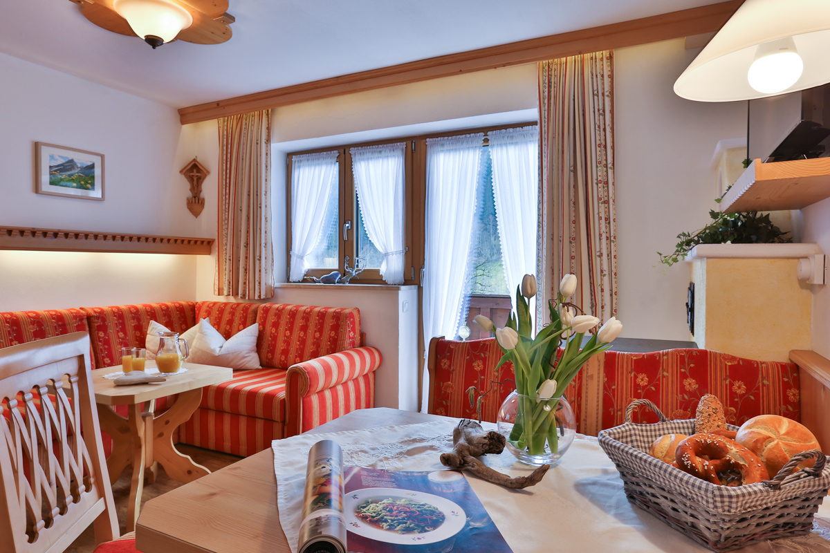 Komplett renovierte 42 qm große Ferienwohnung im 1. Stock inklusive W-LAN sowie einem Südbalkon mit Liegestühlen und herrlichem Blick auf Watzmann, Hochkalter und Reiteralpe. Große Küchenzeile mit 4 Plattenherd, Backofen, Spülmaschine sowie einem Kühlschrank mit Gefrierfach. Beistellbett im Schlafzimmer. Die Wohnung verfügt dazu über ein neues Badezimmer sowie einen Flachbildfernseher im Wohnzimmer.