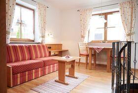 Unsere Ferienwohnung Nr. 1 liegt im Erdgeschoss unseres schönen Hauses. Die Terrasse erstreckt sich über die gesamte Seite des Hauses mit Blick auf das Skigebiet Unterberg Hoch-Kössen und das Kaisergebirge. Im Sommer können Sie die Paraglider beobachten, die am Unterberg ihre Flüge absolvieren. Und im Winter können Sie die Langläufer beobachten, die ganz in der Nähe auf den Loipen ihre Runden drehen. Das Schlafzimmer im Keller erreichen Sie über die Wendeltreppe in der Ferienwohnung.