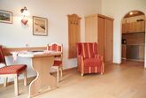 • Wohn-Schlafzimmer mit Doppelbett, Fernsehsesseln, TV Flachbildschirm, Eßplatz