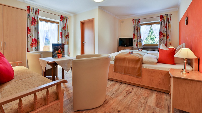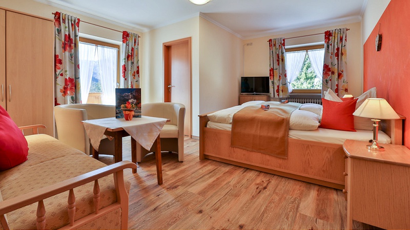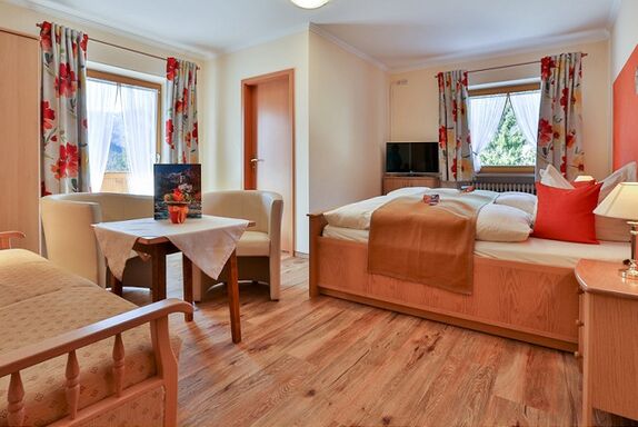Erfrischendes Design und liebevoll gestaltete Nichtraucher-Doppelzimmer (25qm) Modell Mordaualm mit Nachmittagssonne