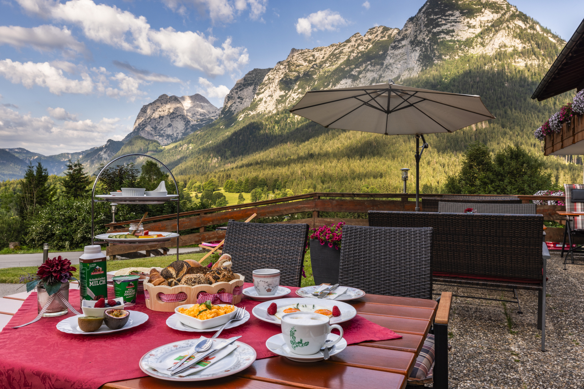 Auf 900m oberhalb des Ramsauer Tales am Fuße des Watzmanns mit einem sagenhaften und sonnigen Blick über die ganze Bergwelt bieten wir Ihnen Wohlig schlafen - Ausgiebig frühstücken - Genussvoll aktiv sein. Unsere im erfrischendem Design eingerichteten Nichtraucher- Komfortzimmer mit einem sonnigen und majestätischen Blick auf Watzmann, Hochkalter und Reiteralpe, bieten einen zeitgemäßen Standard Mit viel Liebe zum Detail, Herz und Leidenschaft begrüßen wir Hobby-Alpinisten, Wiederholungstäter und diejenigen die wir noch begeistern dürfen. Das Frühstück ist unsere großen Leidenschaft und wird jeden Tag individuell mit regionalen Produkten aus der Region mit viel Liebe zubereitet. Sie können dies auf unserer sonnigen Panoramaterrasse oder in unserem urigen Frühstücksraum genießen. Als besonderen Service für unsere Gäste steht ihnen unser Rastplatz mit kostenloser Tee/Kaffeebar, Gästekühlschränken, Bibliothek, Getränkeangebot zur Verfügung. WLAN im Haus kostenlos. Bestpreisgarantie bei Direktbuchung über Homepage oder per Email unter , es lohnt sich!! Oder einfach anrufen und sofort buchen. Wir freuen uns auf Sie!