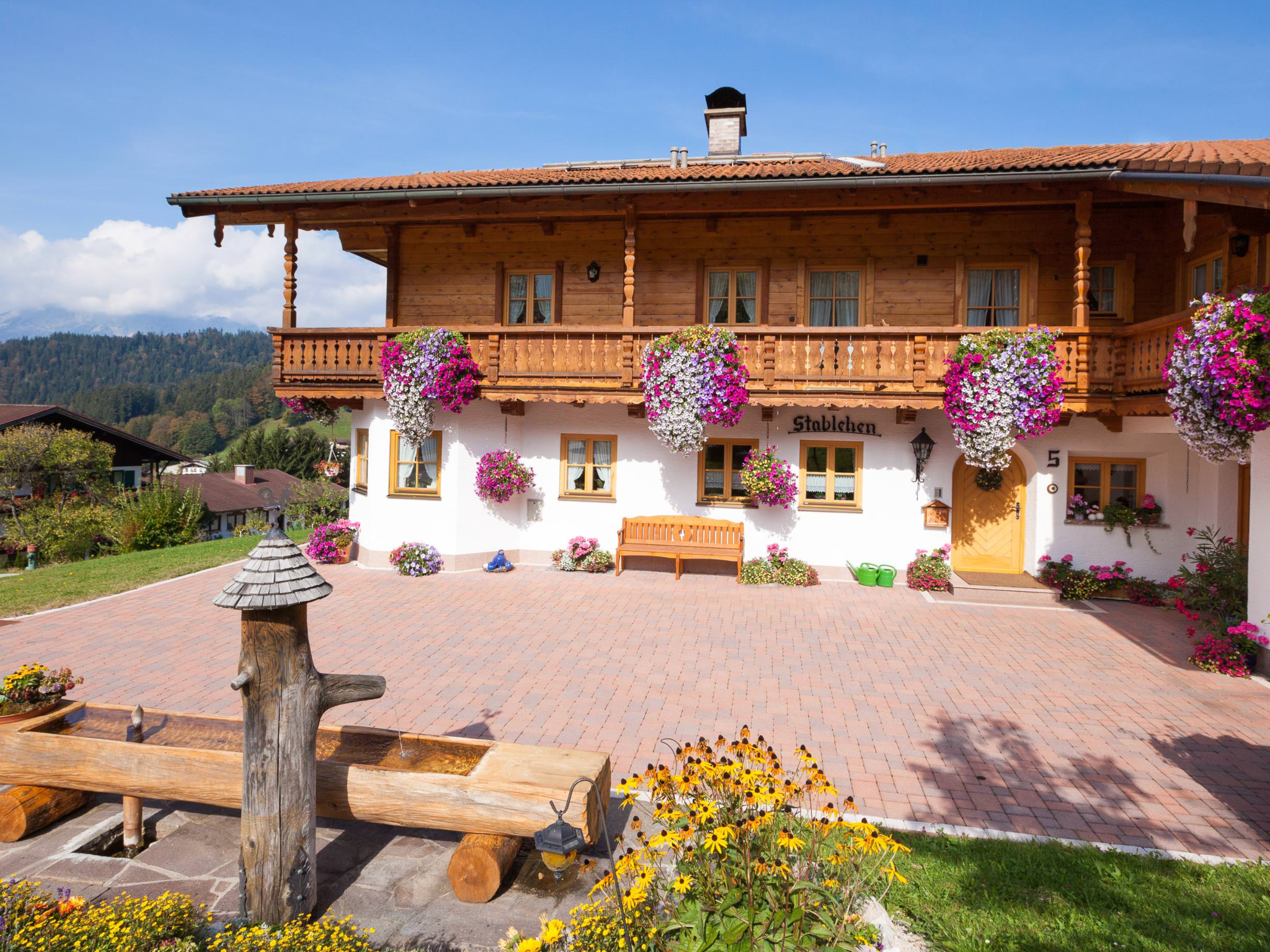 Wir führen ein Haus im gemütlichen oberbayerischen Stil. Unser großer Balkon (Tisch-, Sitz und Liegegelegenheit) bietet Ihnen Erholung und Entspannung. Genießen Sie von dort das herrliche Panorama inmitten einer traumhaften Bergwelt. Es bieten sich viele Möglichkeiten um einen angenehmen Aufenthalt zu erleben: idealer Ausgangspunkt für schöne Wanderungen; Einkaufsmöglichkeiten, Bank und Gaststätten sind in 15 Gehminuten zu erreichen; Ausflugsmöglichkeiten wie Salzbergwerk und Sommerrodelbahnen sind in nächster Nähe; Skigebiet Rossfeld, präparierte Verbindungs-Skiabfahrten Österreich-Oberau, Winterrodelbahnen und Langlaufloipen sind in wenigen Minuten zu erreichen.