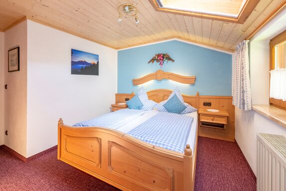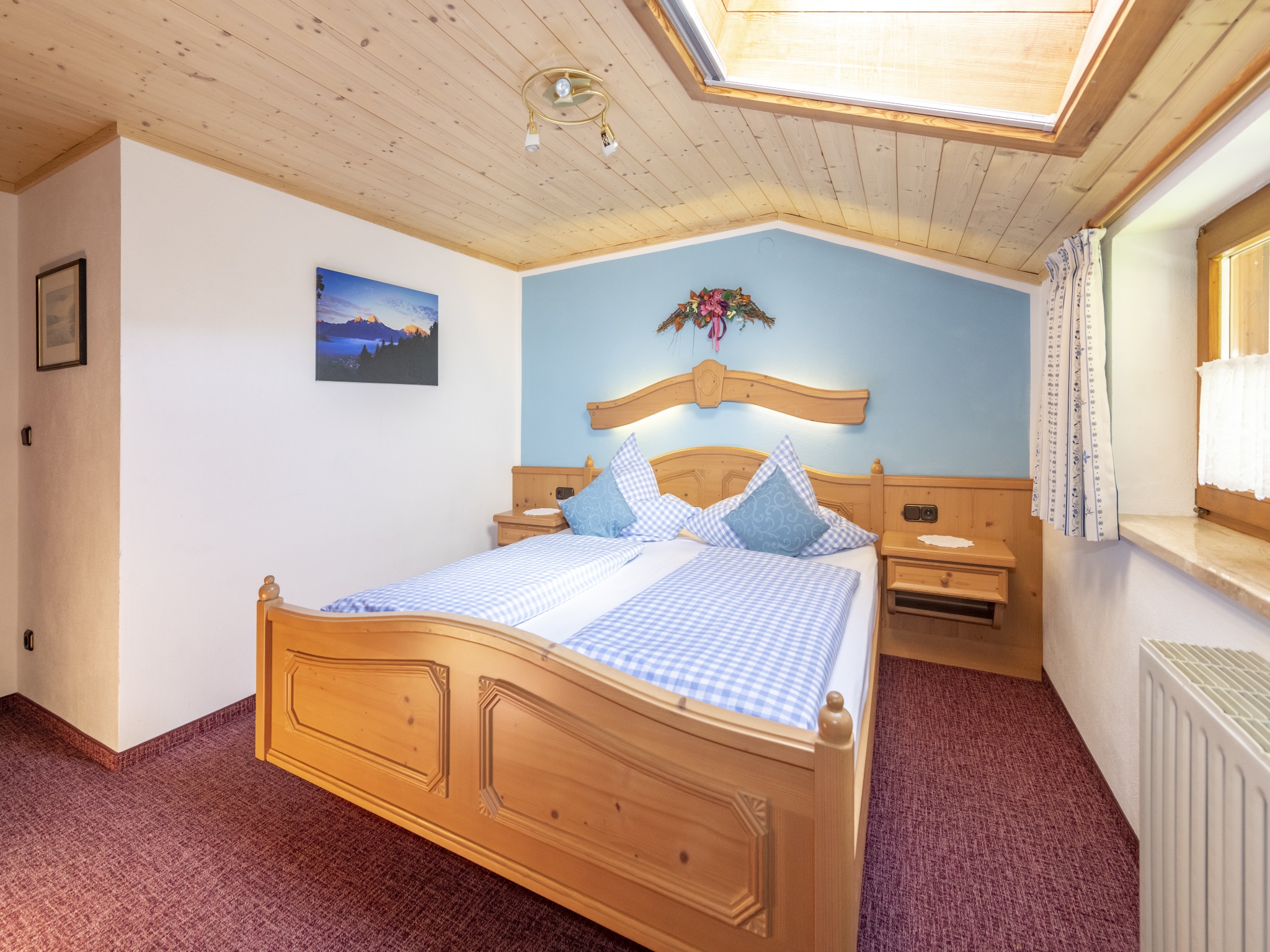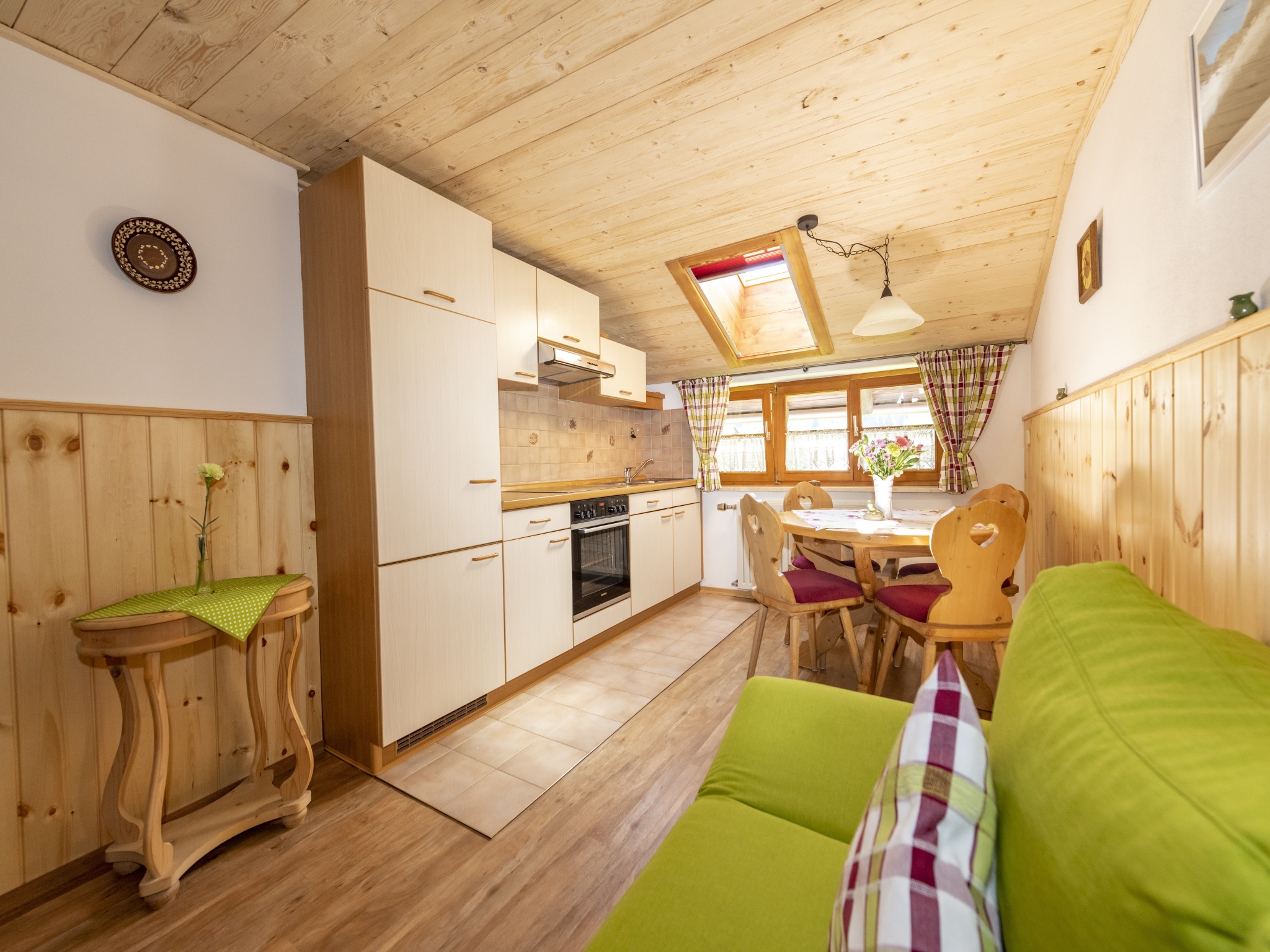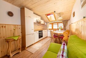 Unsere liebevoll eingerichtete und helle Dachgeschoßwohnung Wiesenblume (ohne Balkon) befindet sich im 2. OG und ist für zwei Personen ausgelegt. Sie verfügt über eine gemütlich eingerichtete Wohnküche mit ausziehbarer Couch und Flach-Sat-TV sowie separatem Schlafzimmer und einem Bad mit Dusche/WC, Fön und Kosmetikspiegel. Ein eigener Balkonanteil im 1. Stock steht für unsere Gäste zur Nutzung bereit. Dort kann man bereits am Morgen die Sonne und den Bergblick genießen. Die sonnige Terrasse mit Liegewiese lädt ebenfalls jederzeit zum Verweilen ein.